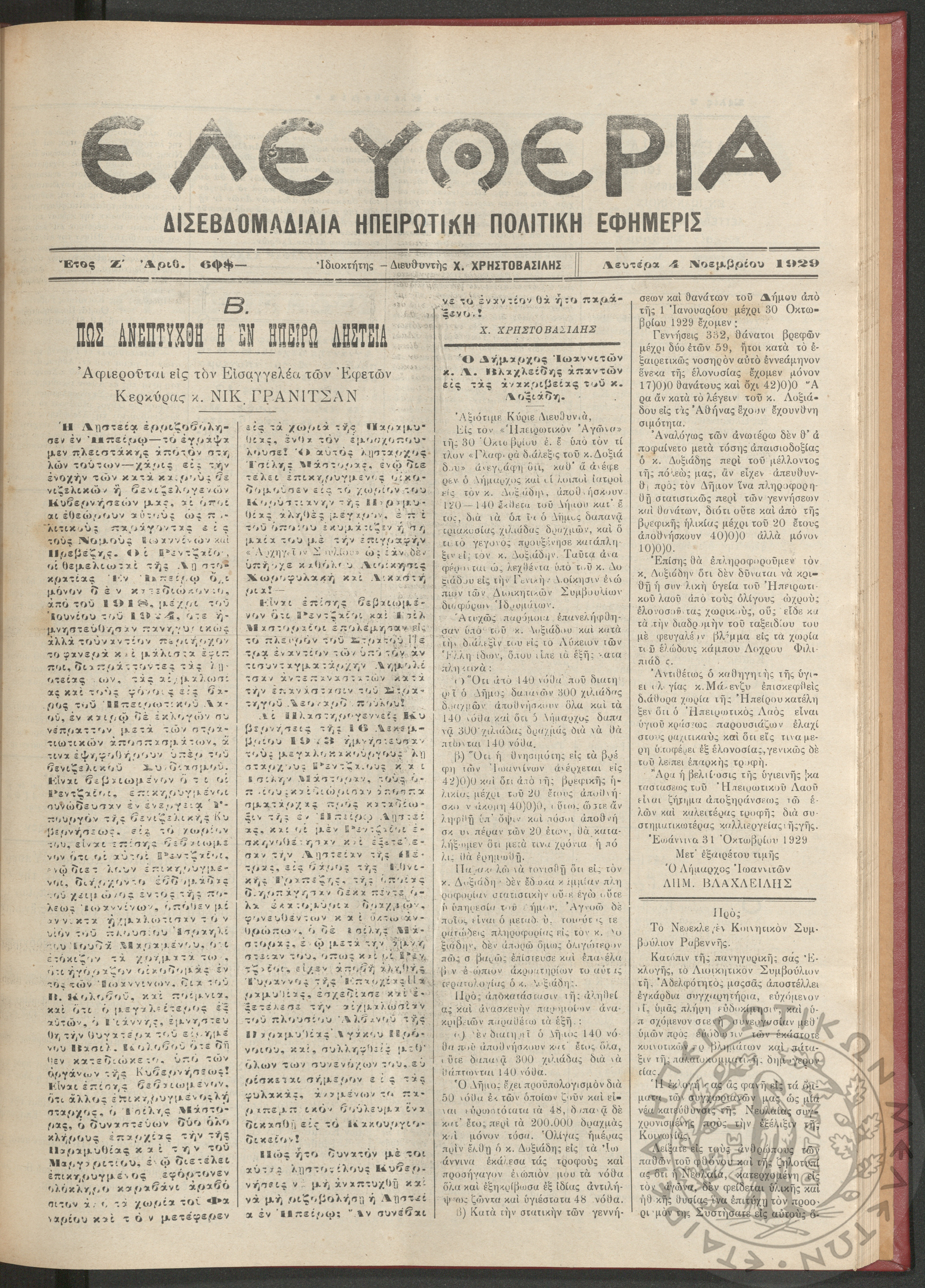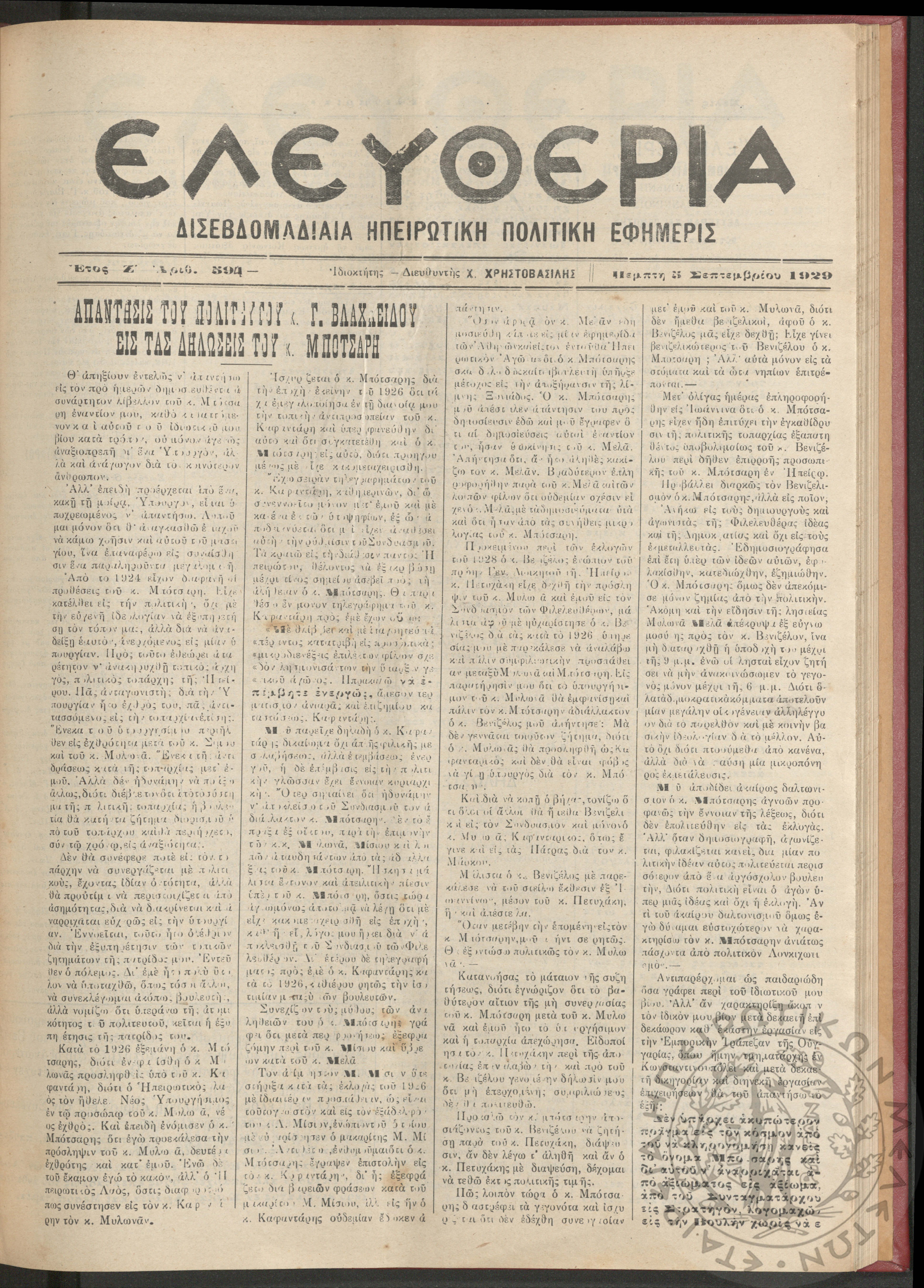 Ελευθερία: δισεβδομαδιαία Ηπειρωτική πολιτική εφημερίς, 1929, φ. 594