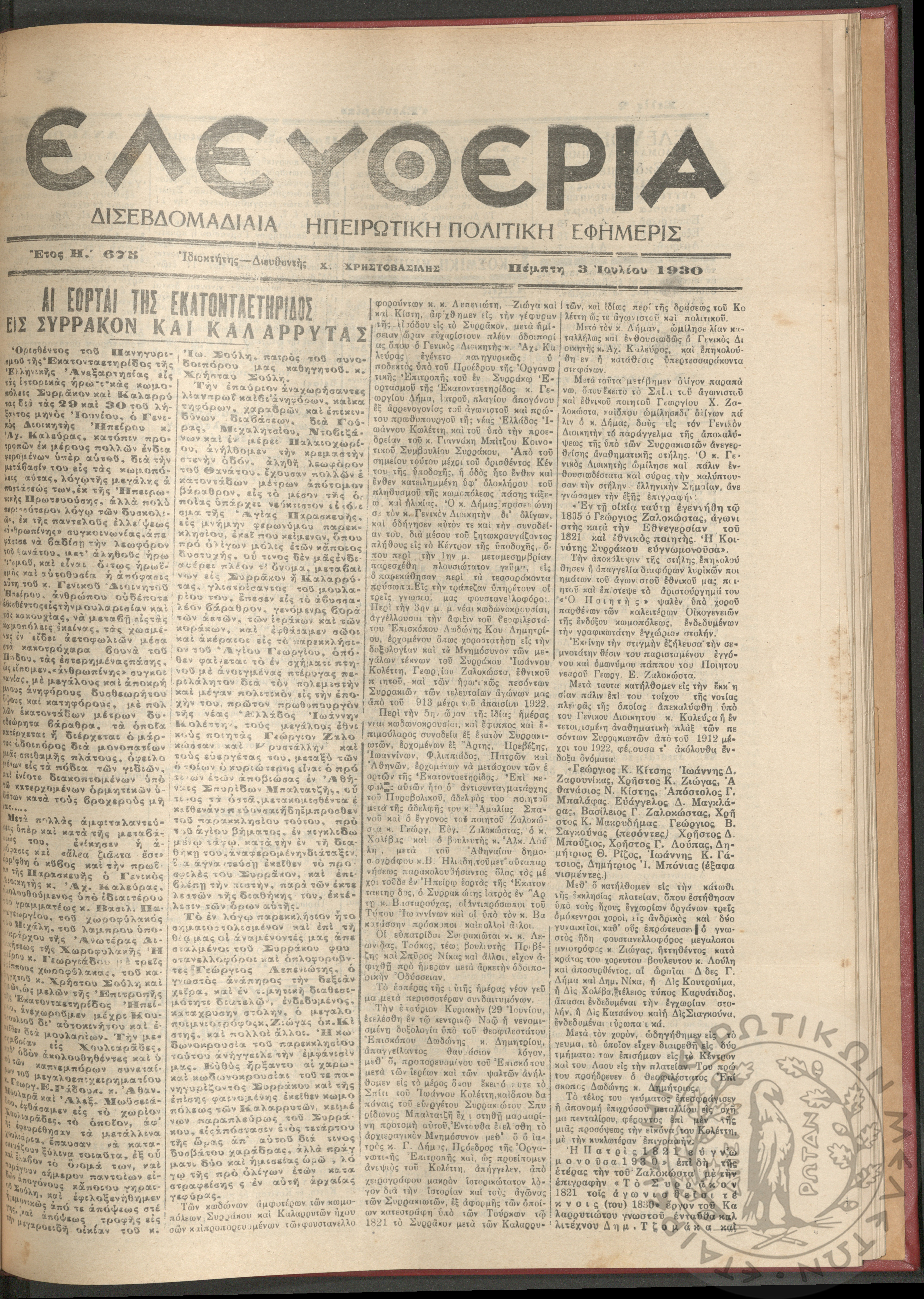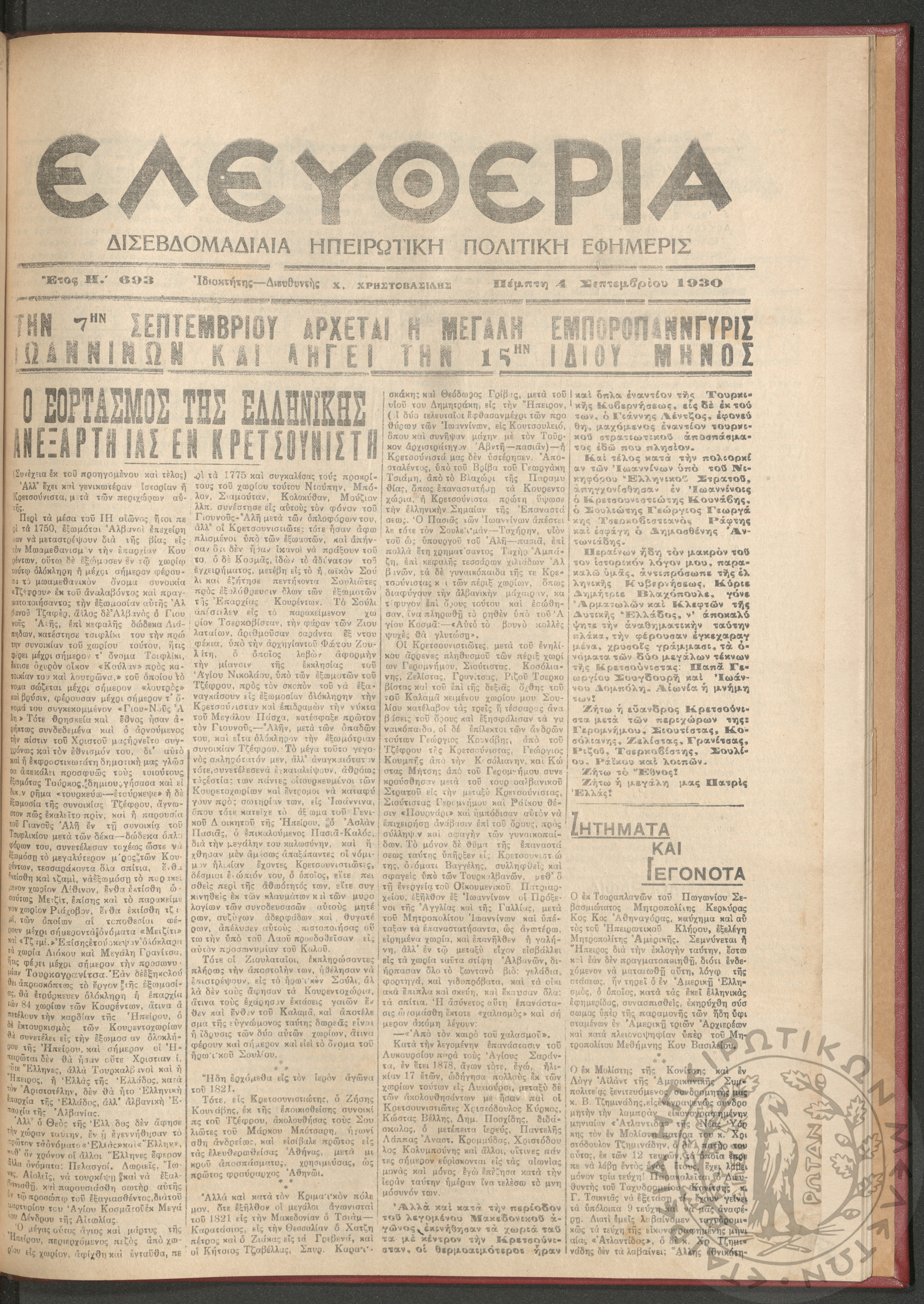 Ελευθερία: δισεβδομαδιαία Ηπειρωτική πολιτική εφημερίς, 1930, φ. 693