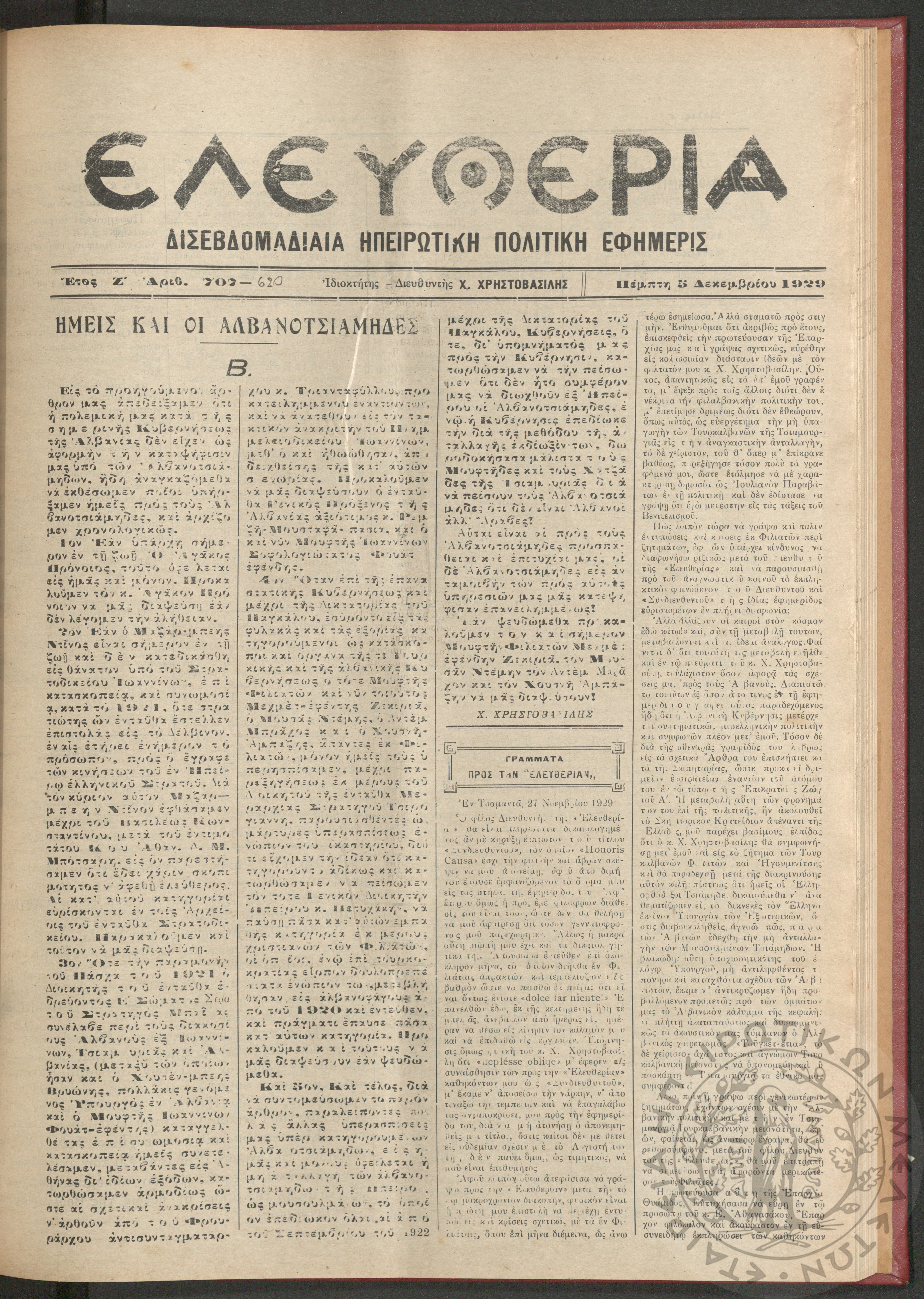 Ελευθερία: δισεβδομαδιαία Ηπειρωτική πολιτική εφημερίς, 1929, [φ. 707-620]