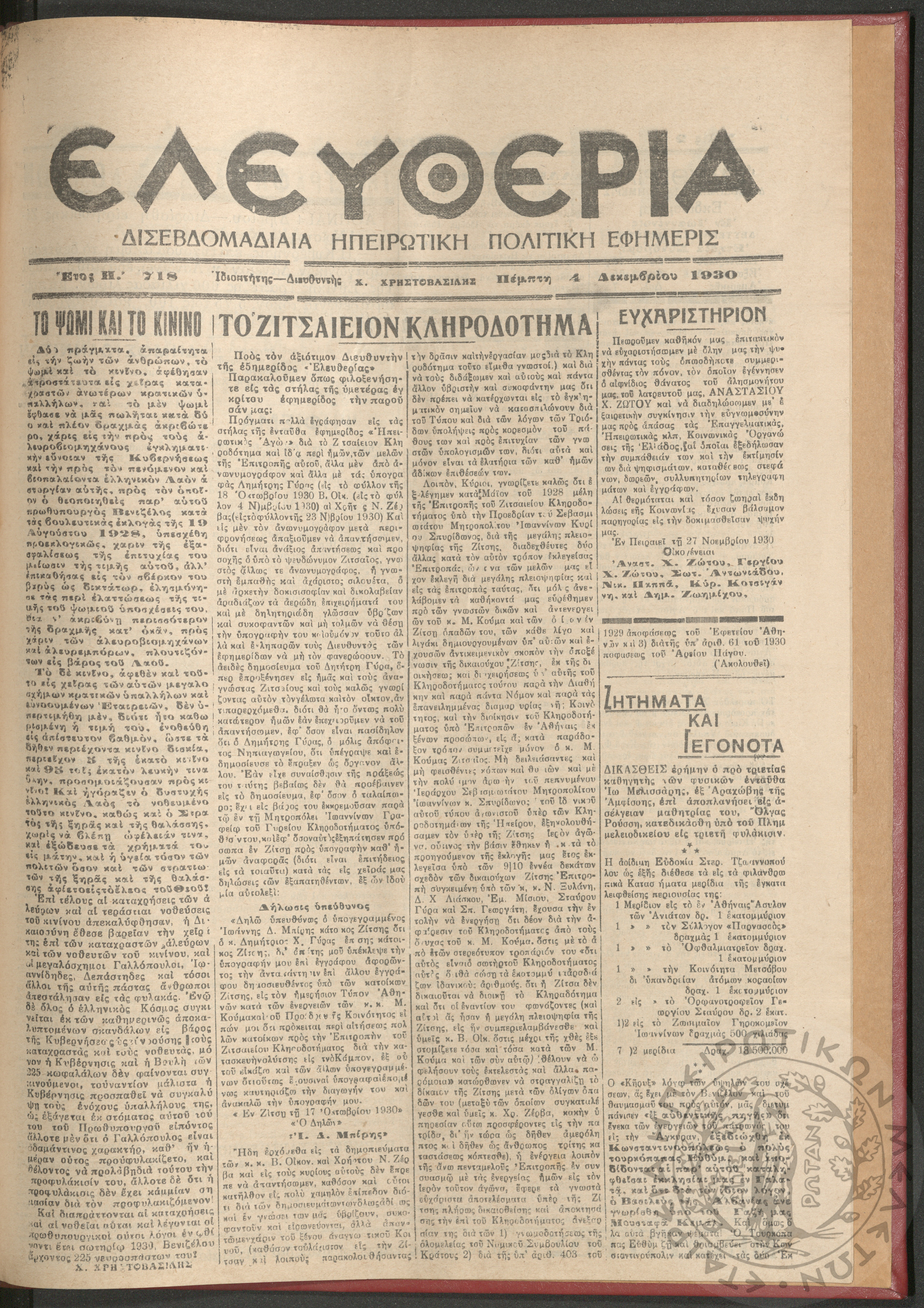 Ελευθερία: δισεβδομαδιαία Ηπειρωτική πολιτική εφημερίς, 1930, φ. 718