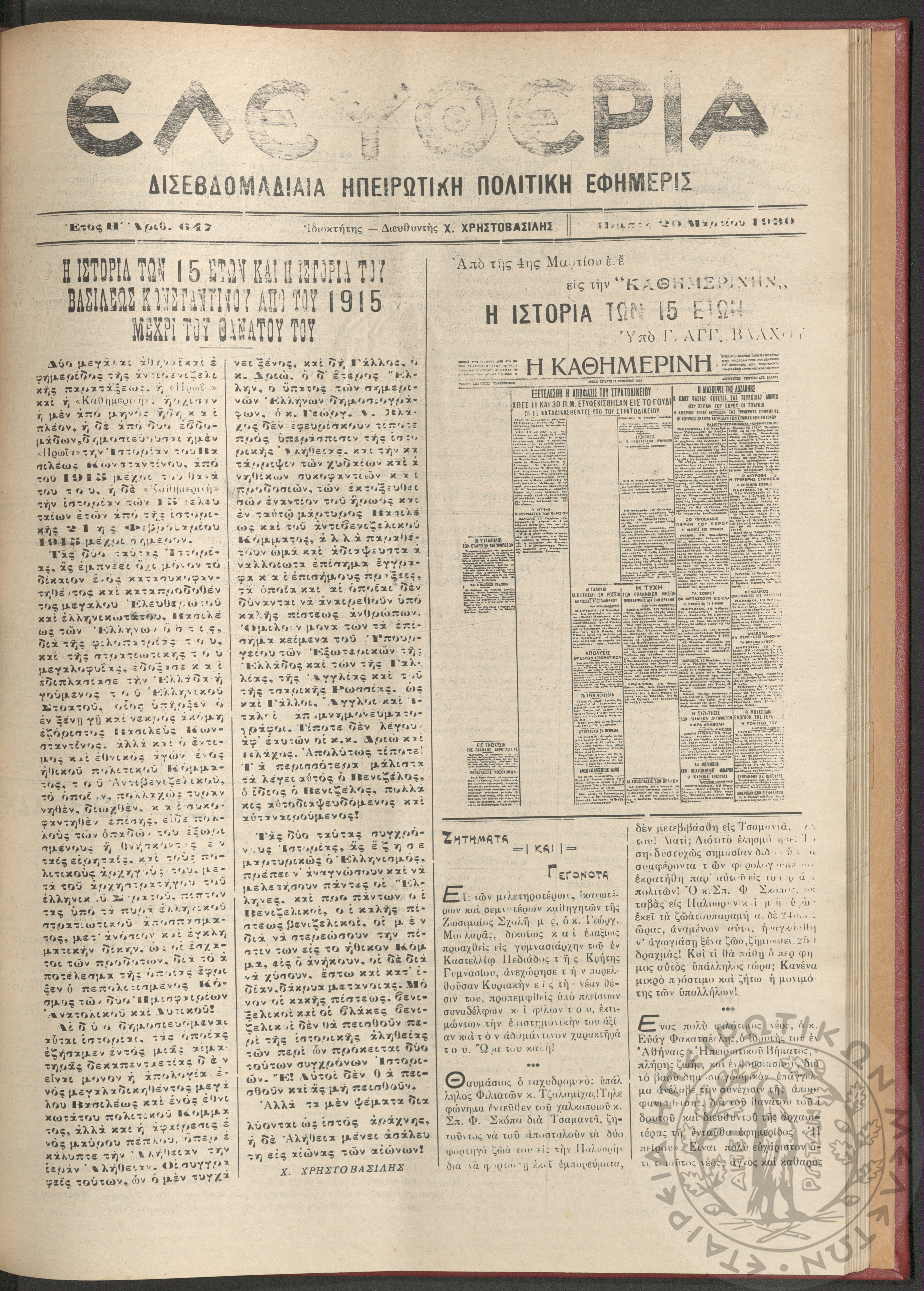 Ελευθερία: δισεβδομαδιαία Ηπειρωτική πολιτική εφημερίς, 1930, φ. 647