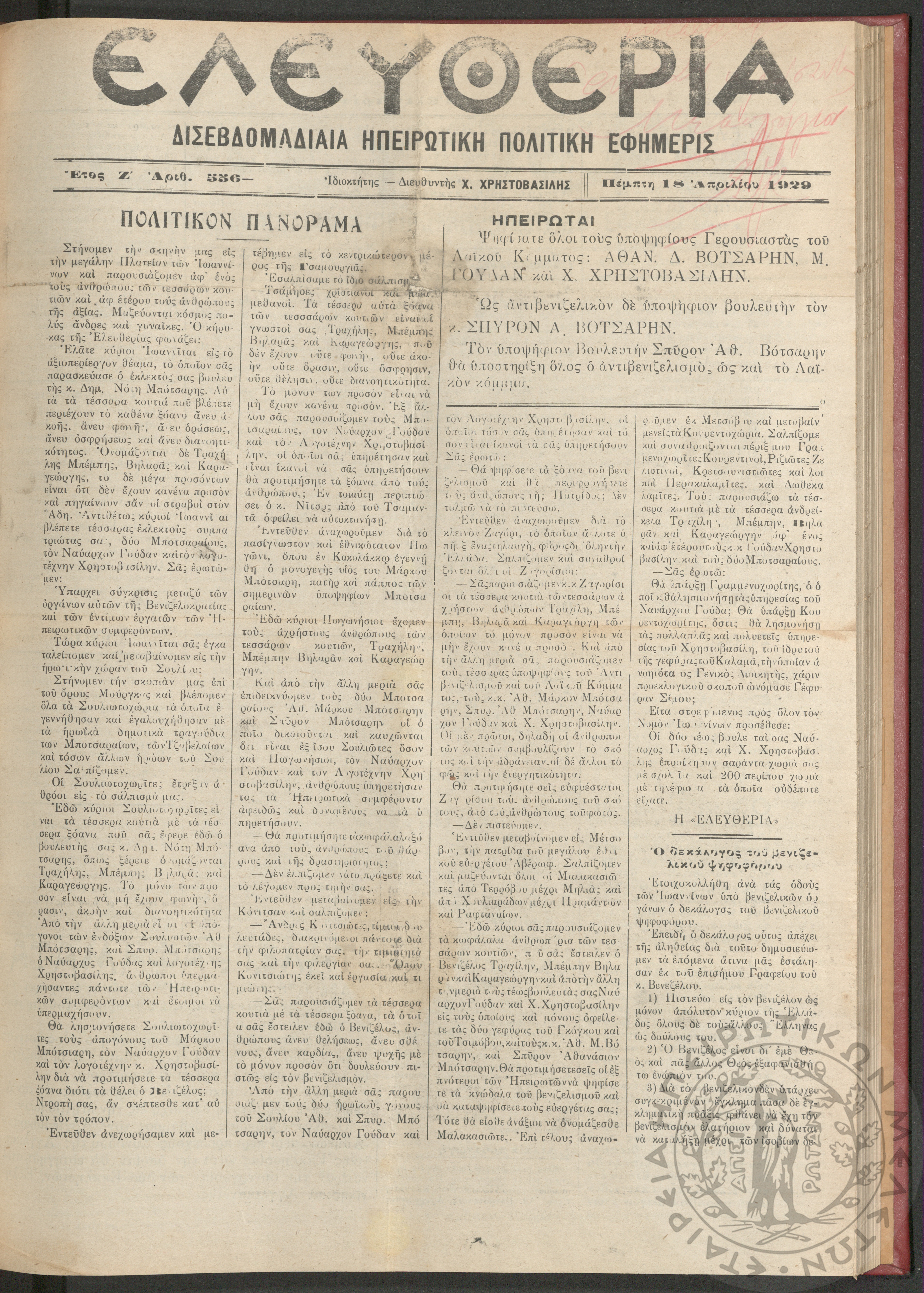 Ελευθερία: δισεβδομαδιαία Ηπειρωτική πολιτική εφημερίς, 1929, φ. 556