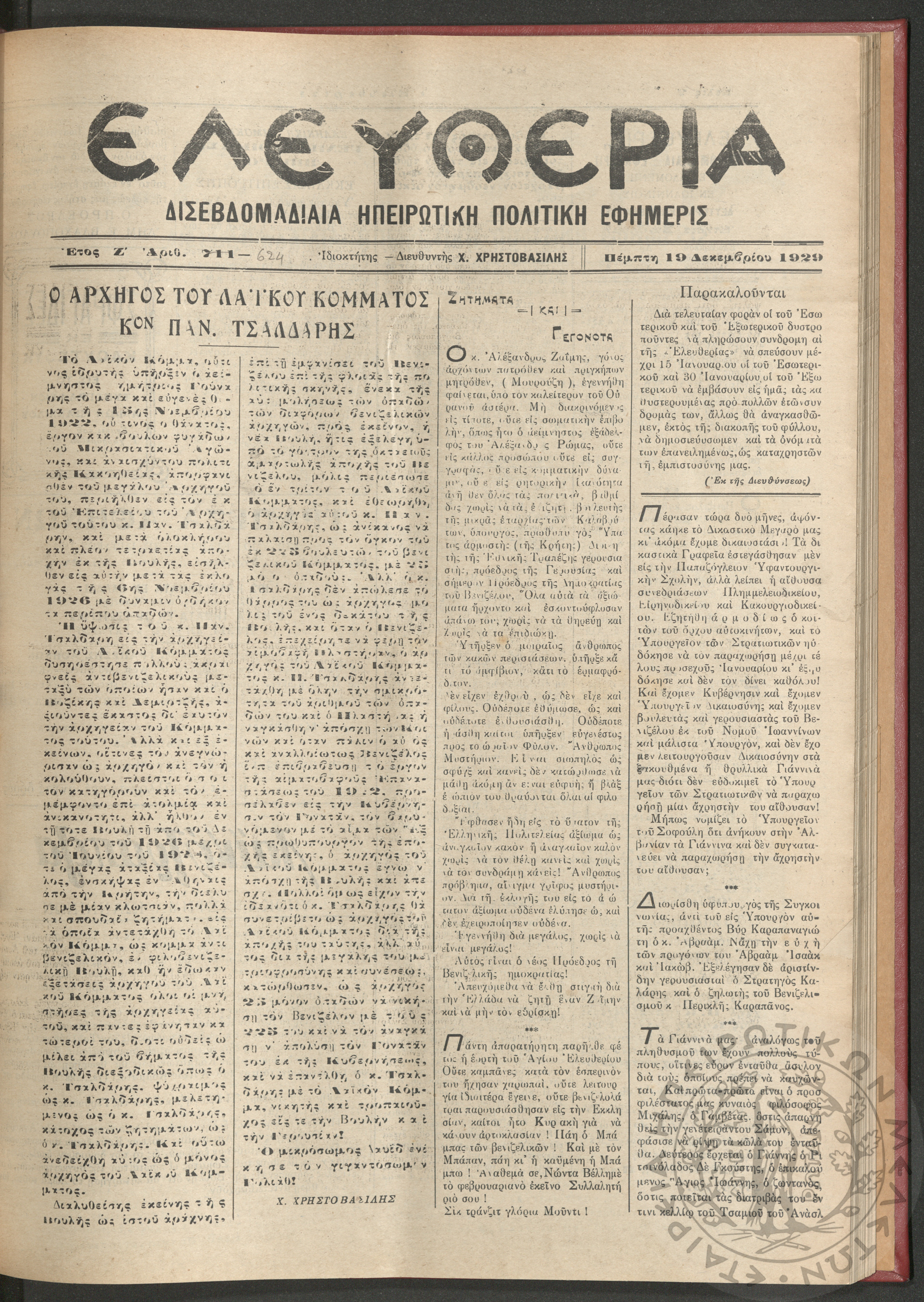 Ελευθερία: δισεβδομαδιαία Ηπειρωτική πολιτική εφημερίς, 1929, φ. 624