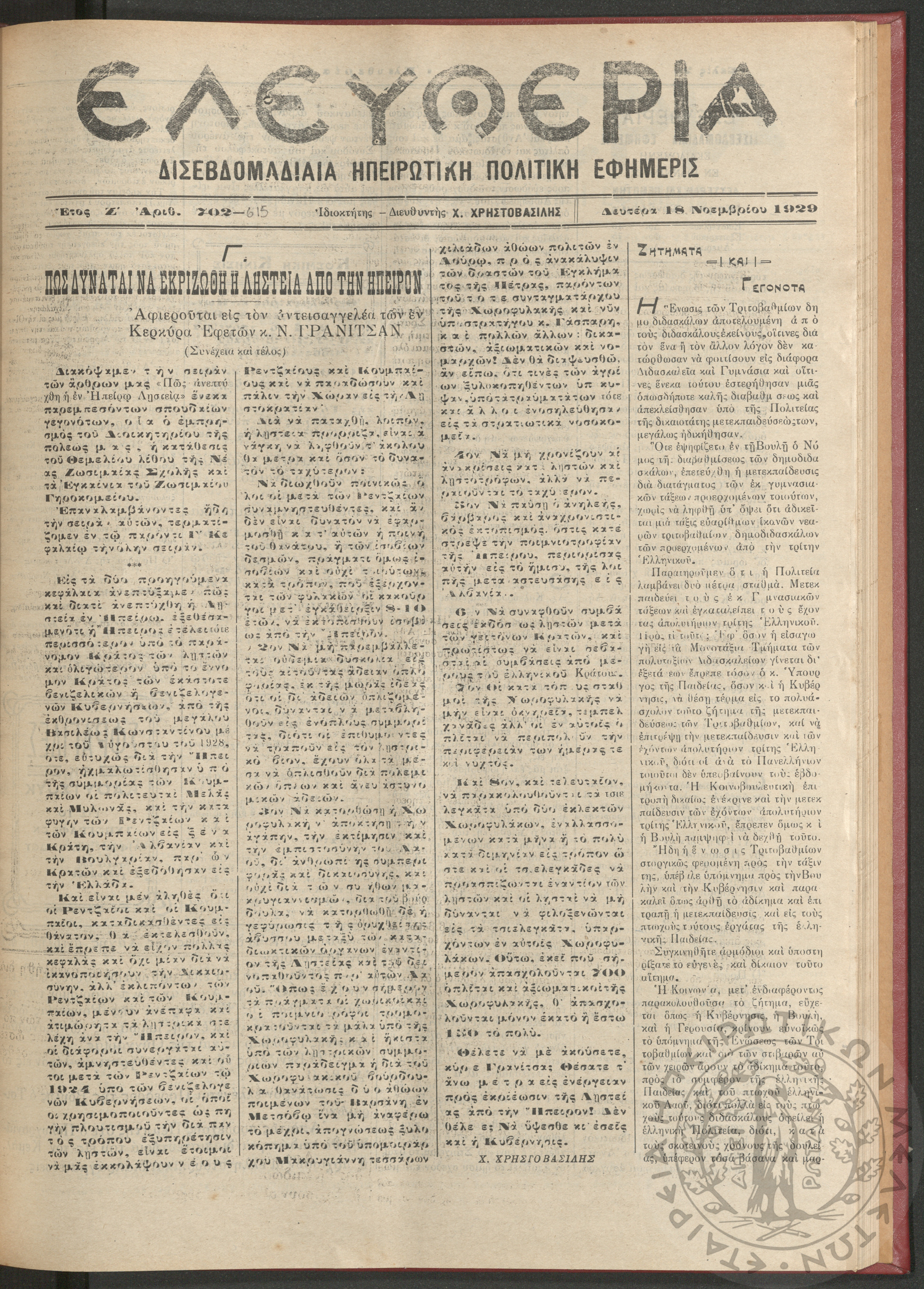 Ελευθερία: δισεβδομαδιαία Ηπειρωτική πολιτική εφημερίς, 1929, φ. 702-615