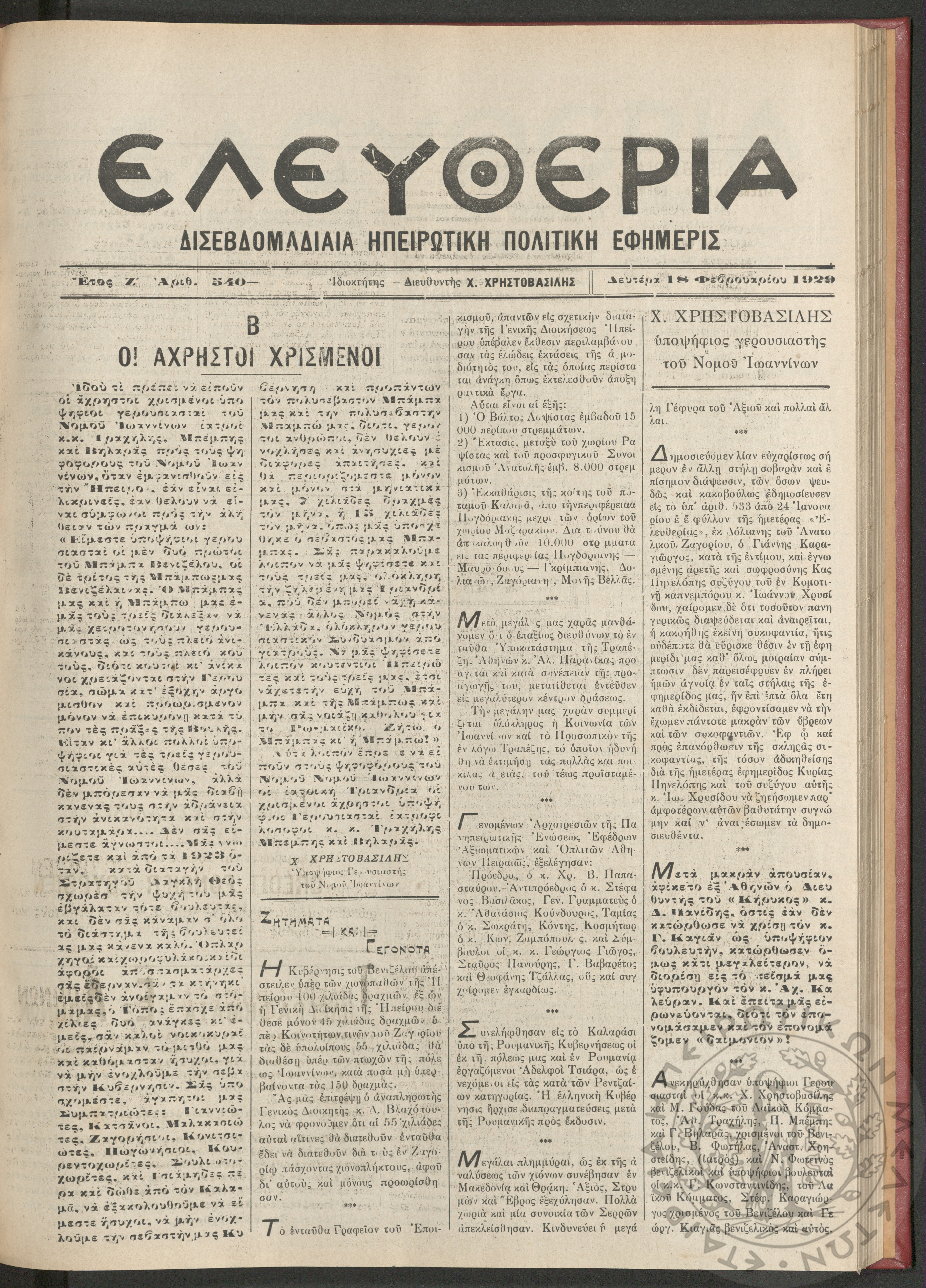 Ελευθερία: δισεβδομαδιαία Ηπειρωτική πολιτική εφημερίς, 1929, φ. 540