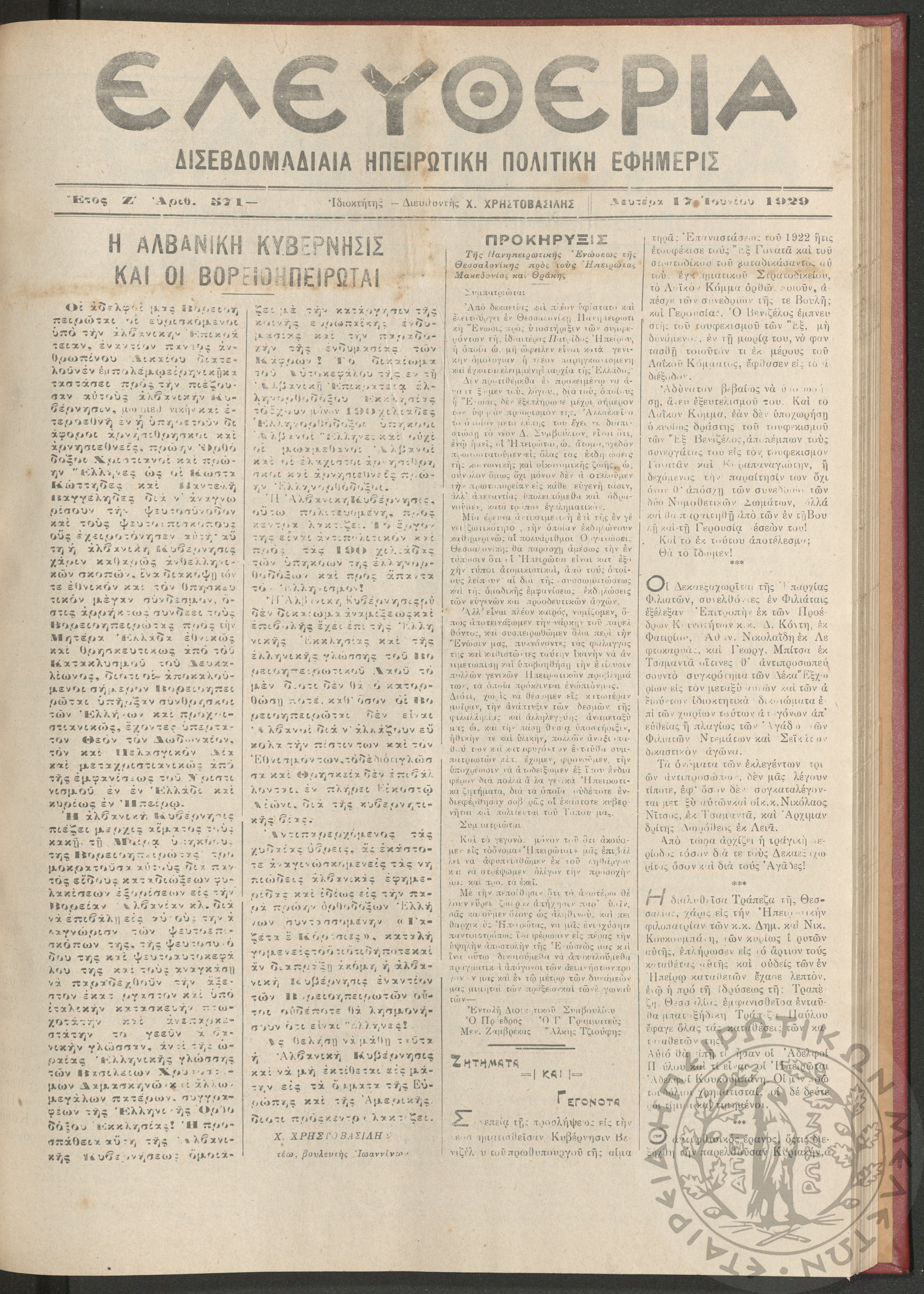 Ελευθερία: δισεβδομαδιαία Ηπειρωτική πολιτική εφημερίς, 1929, φ. 571