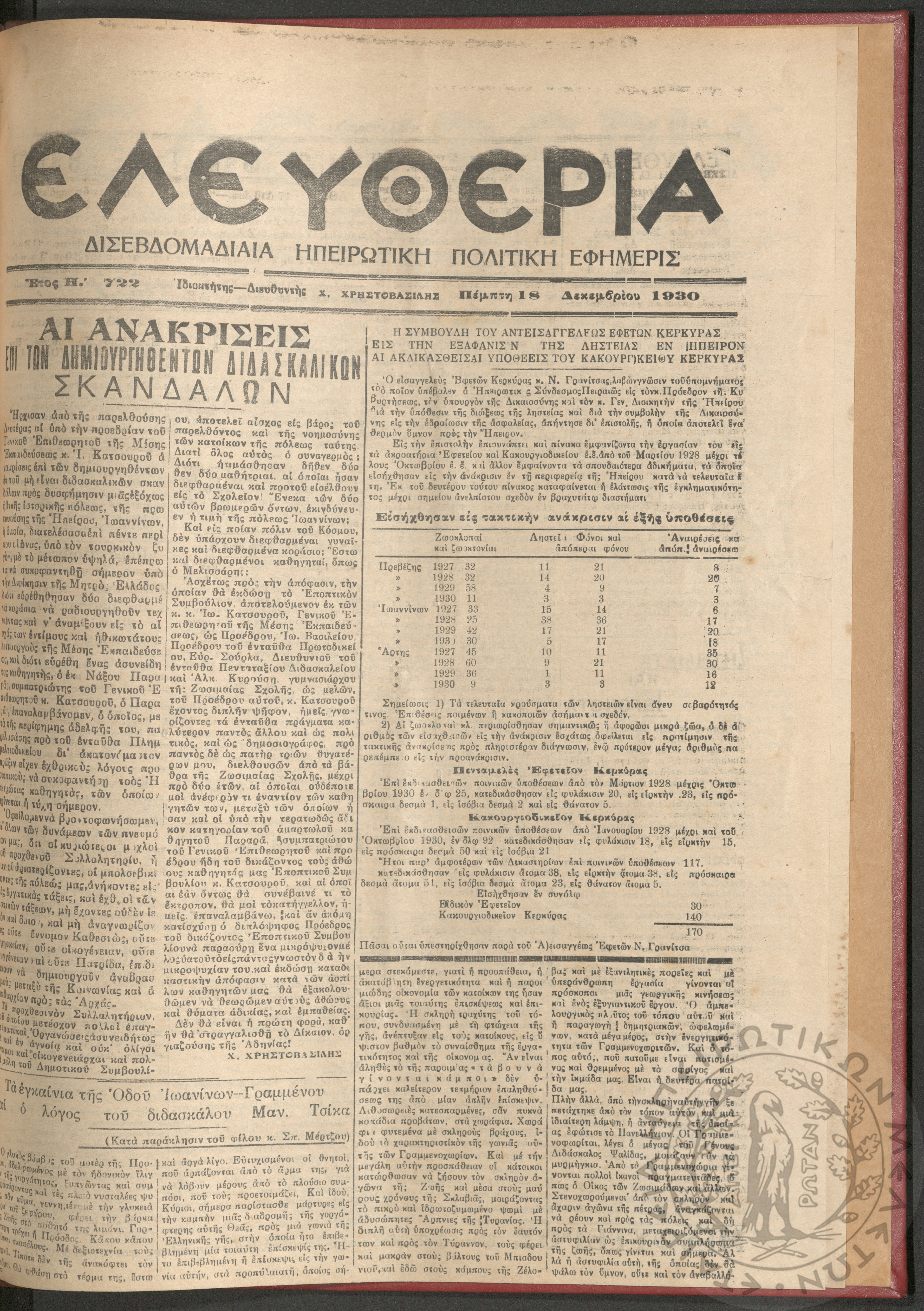 Ελευθερία: δισεβδομαδιαία Ηπειρωτική πολιτική εφημερίς, 1930, φ. 722