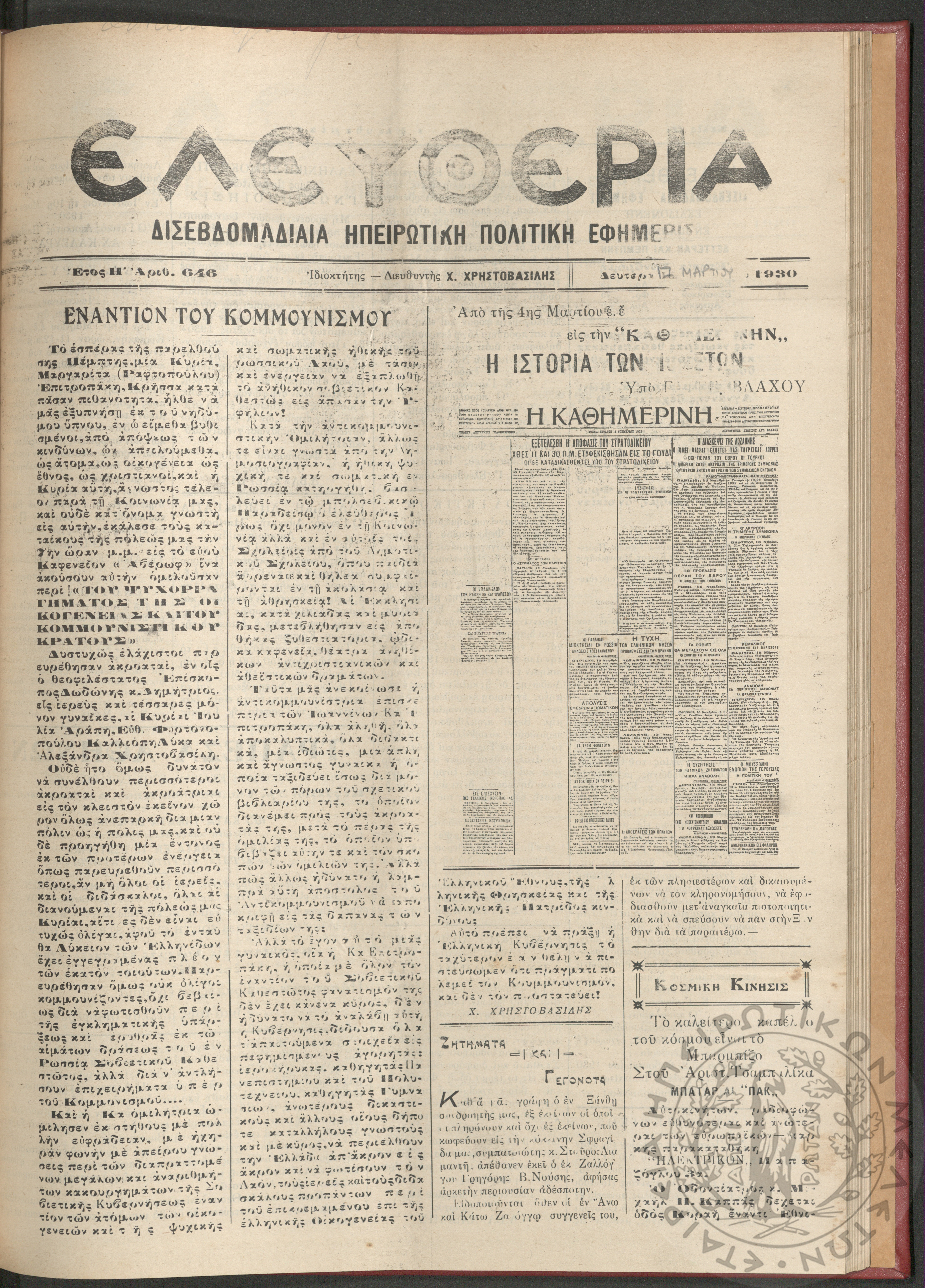 Ελευθερία: δισεβδομαδιαία Ηπειρωτική πολιτική εφημερίς, 1930, φ. 646