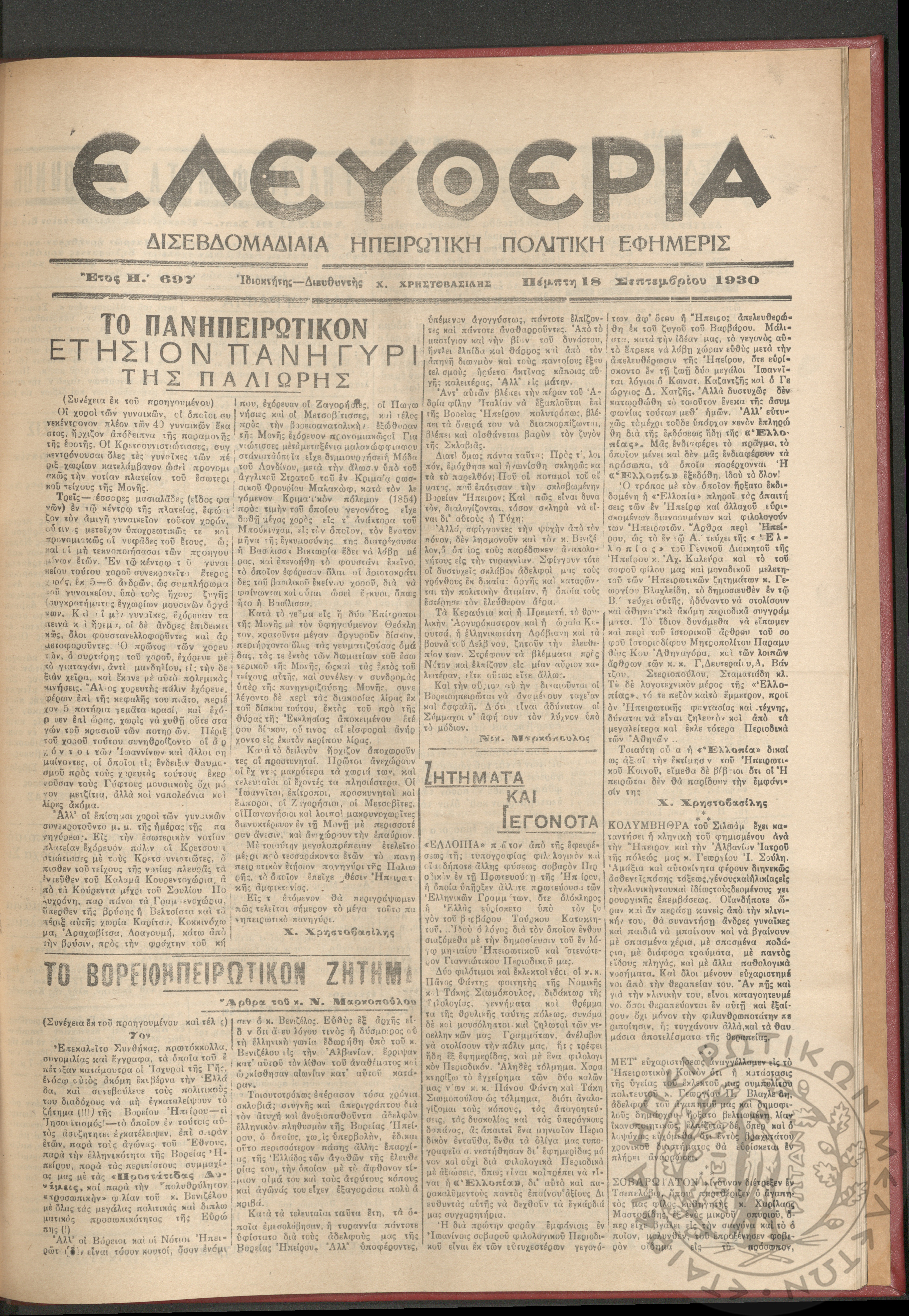 Ελευθερία: δισεβδομαδιαία Ηπειρωτική πολιτική εφημερίς, 1930, φ. 697