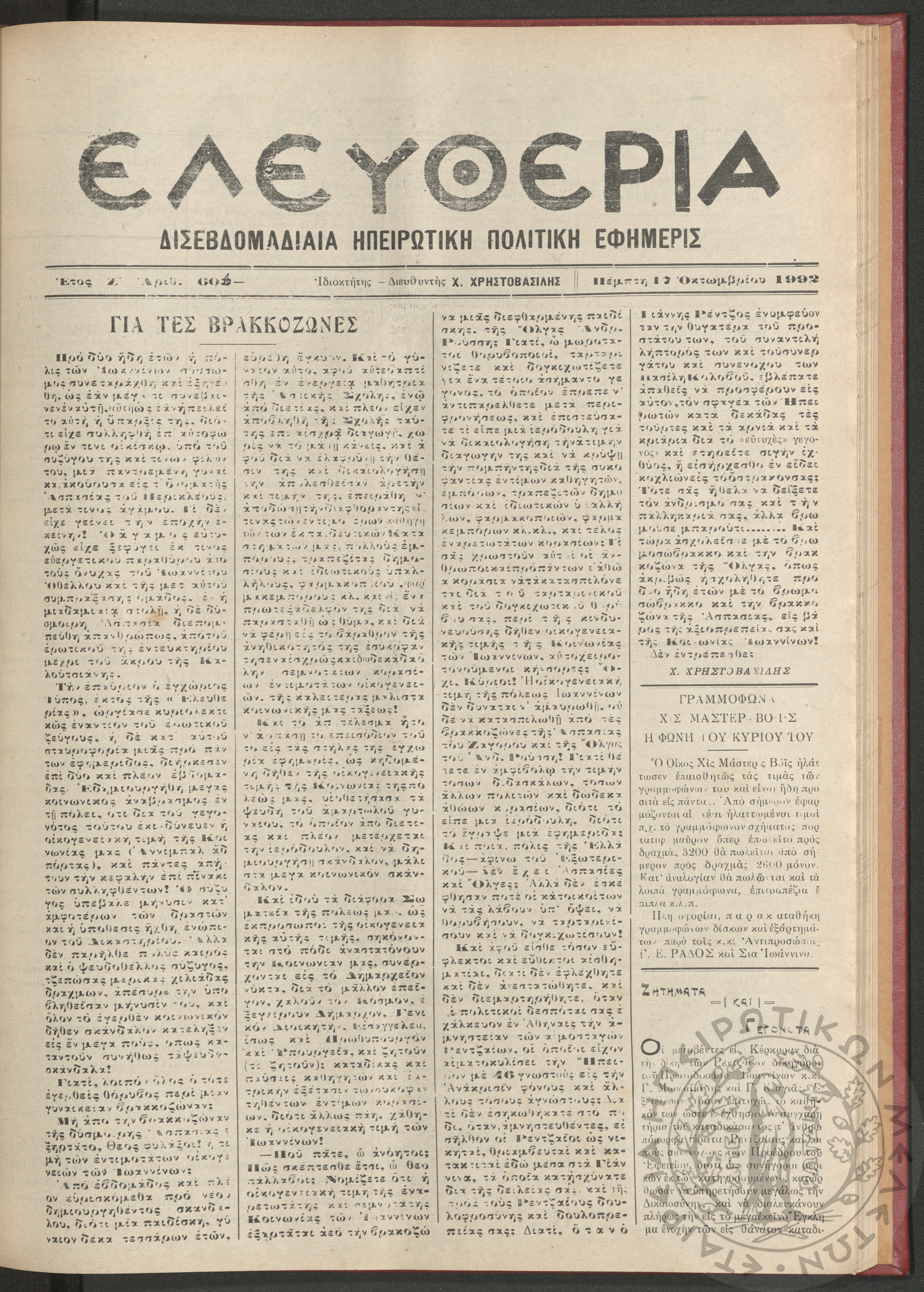 Ελευθερία: δισεβδομαδιαία Ηπειρωτική πολιτική εφημερίς, 1929, φ. 606