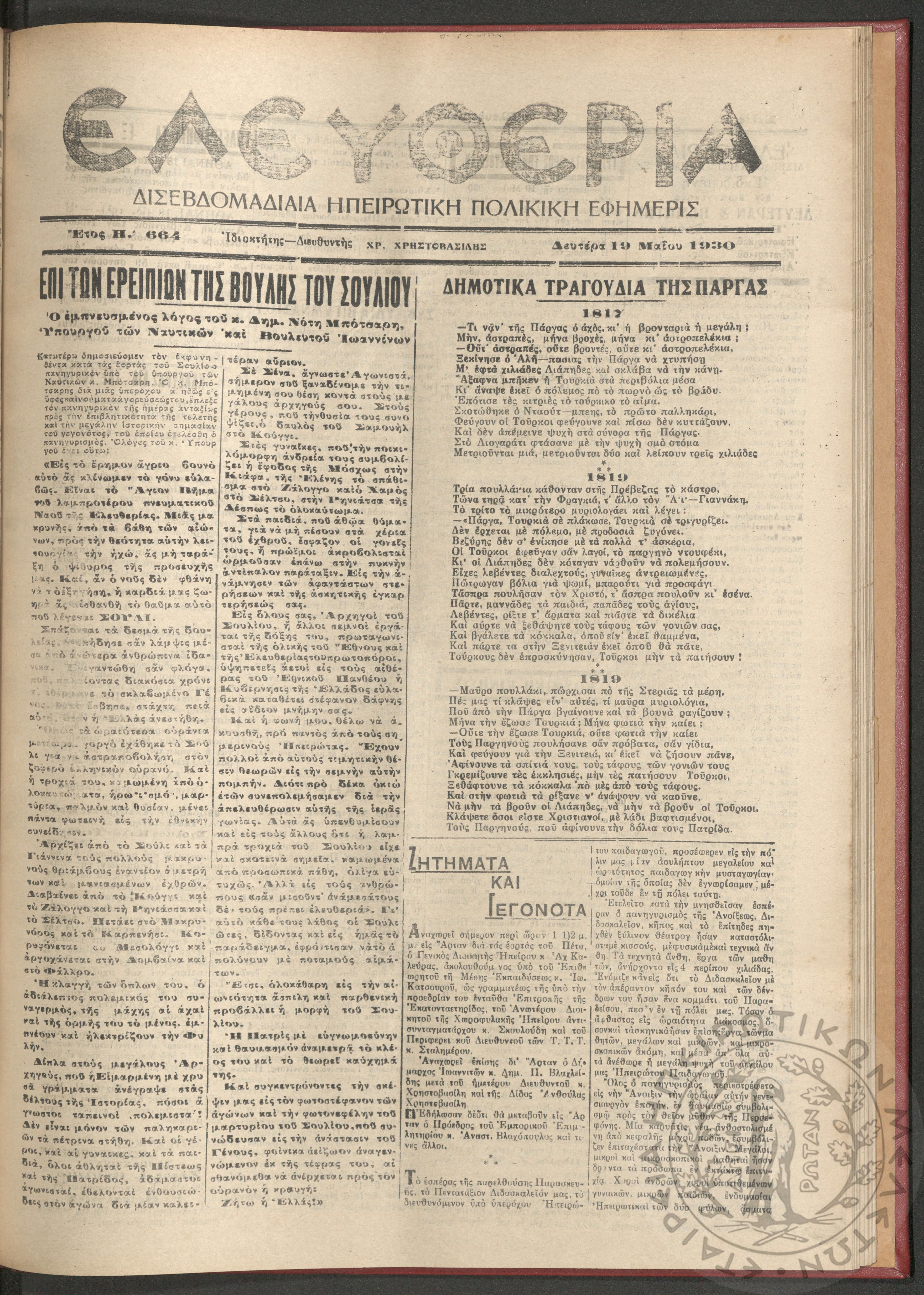 Ελευθερία: δισεβδομαδιαία Ηπειρωτική πολιτική εφημερίς, 1930, φ. 664