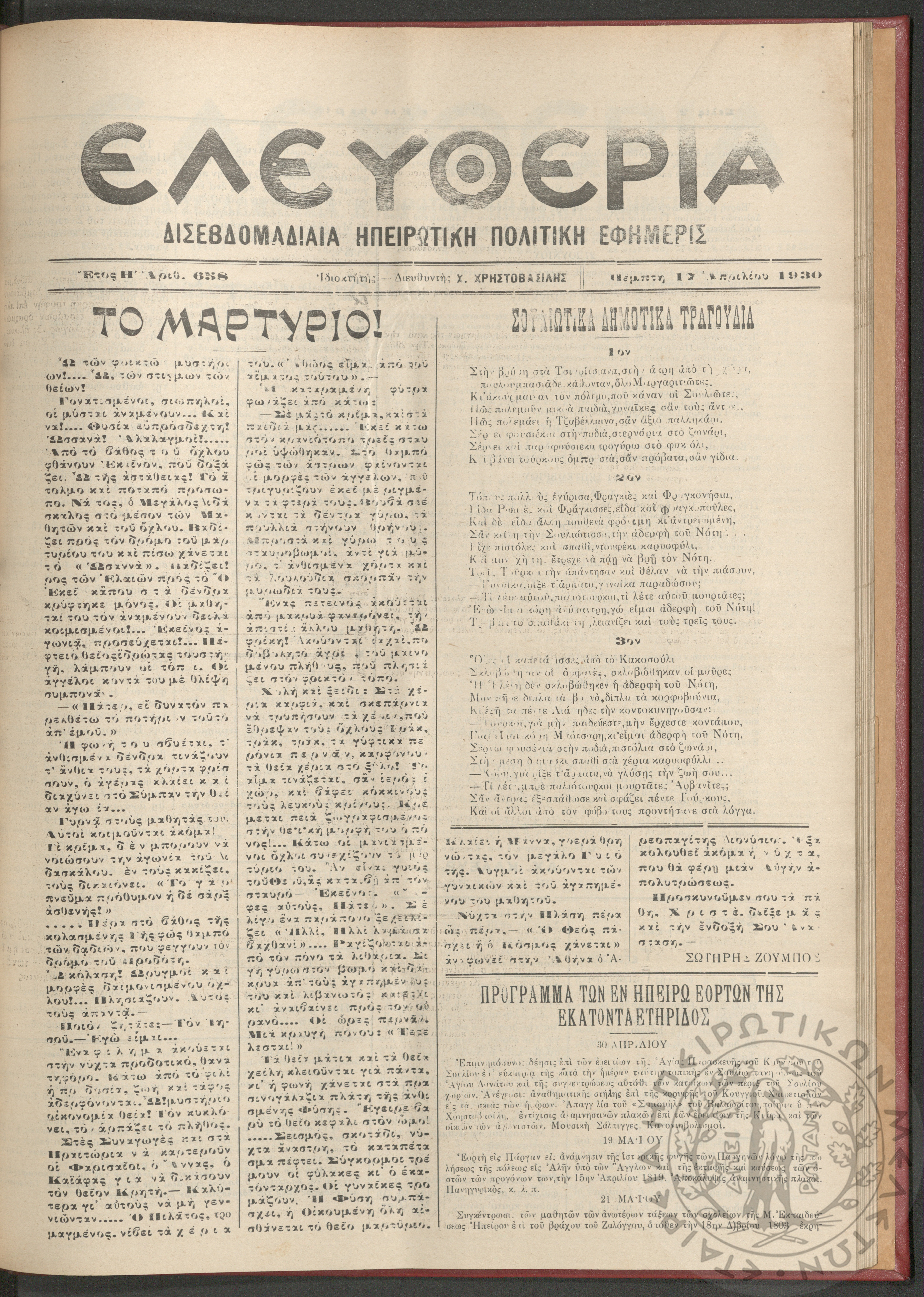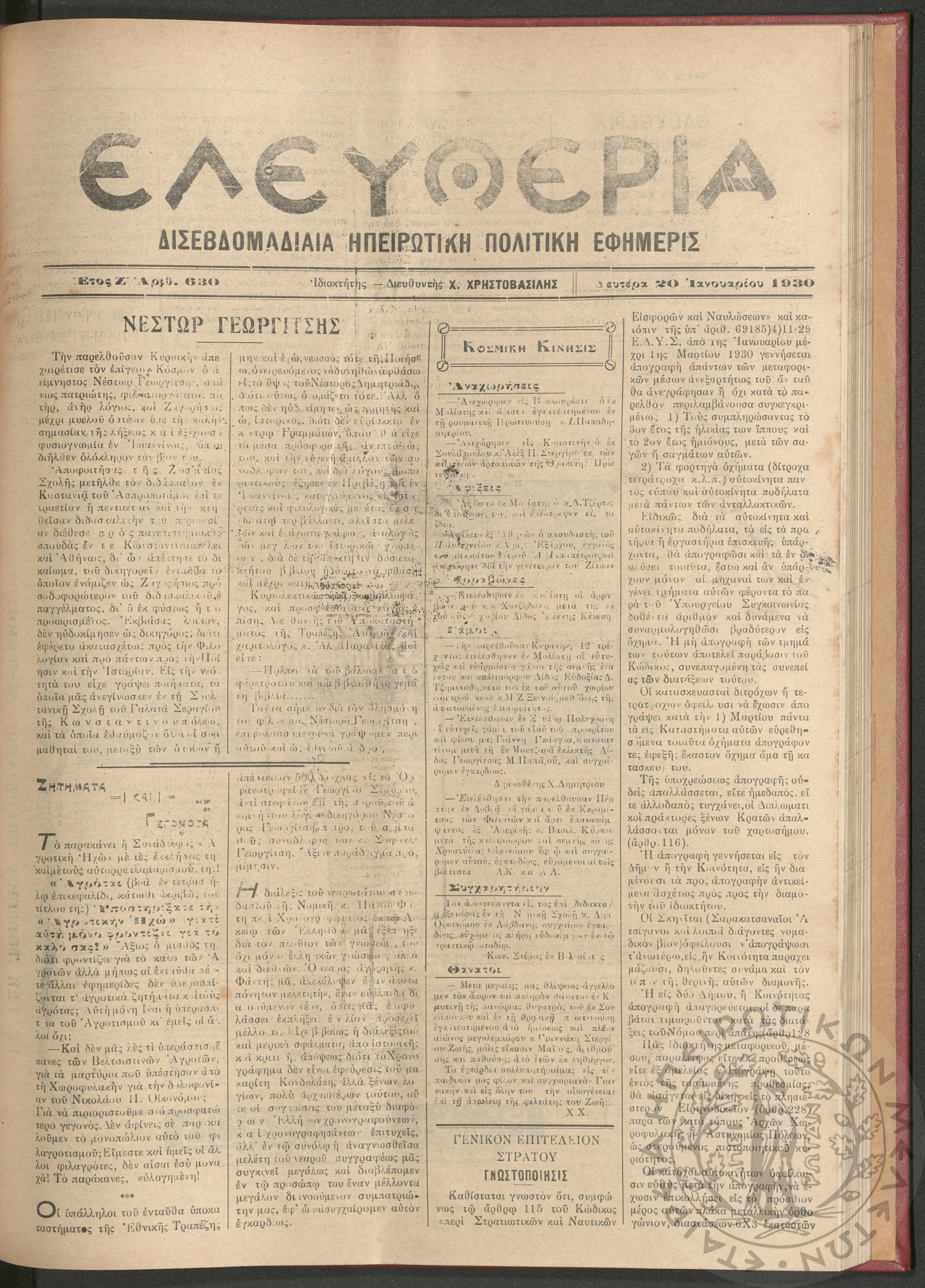 Ελευθερία: δισεβδομαδιαία Ηπειρωτική πολιτική εφημερίς, 1930, φ. 630