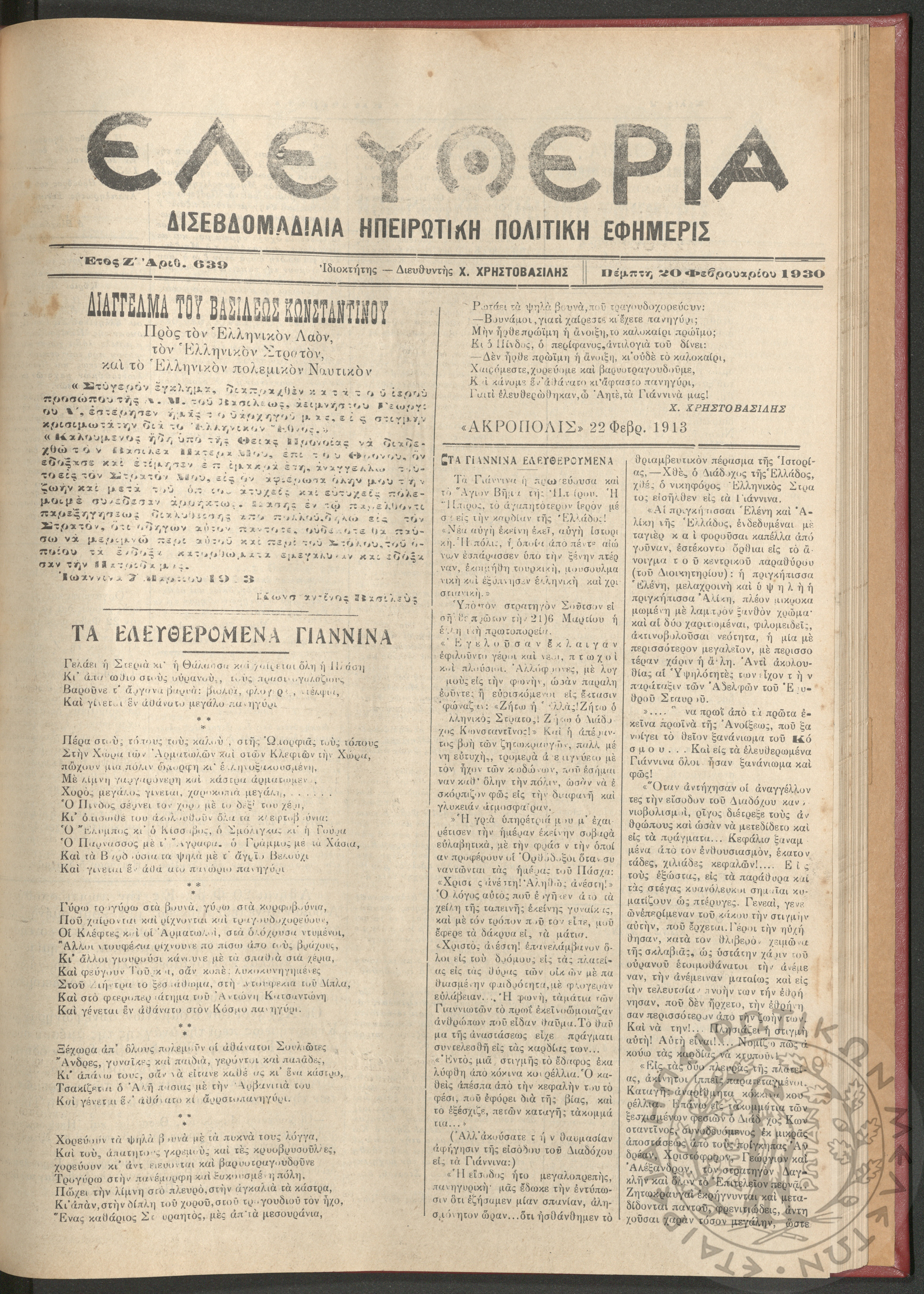 Ελευθερία: δισεβδομαδιαία Ηπειρωτική πολιτική εφημερίς, 1930, φ. 639