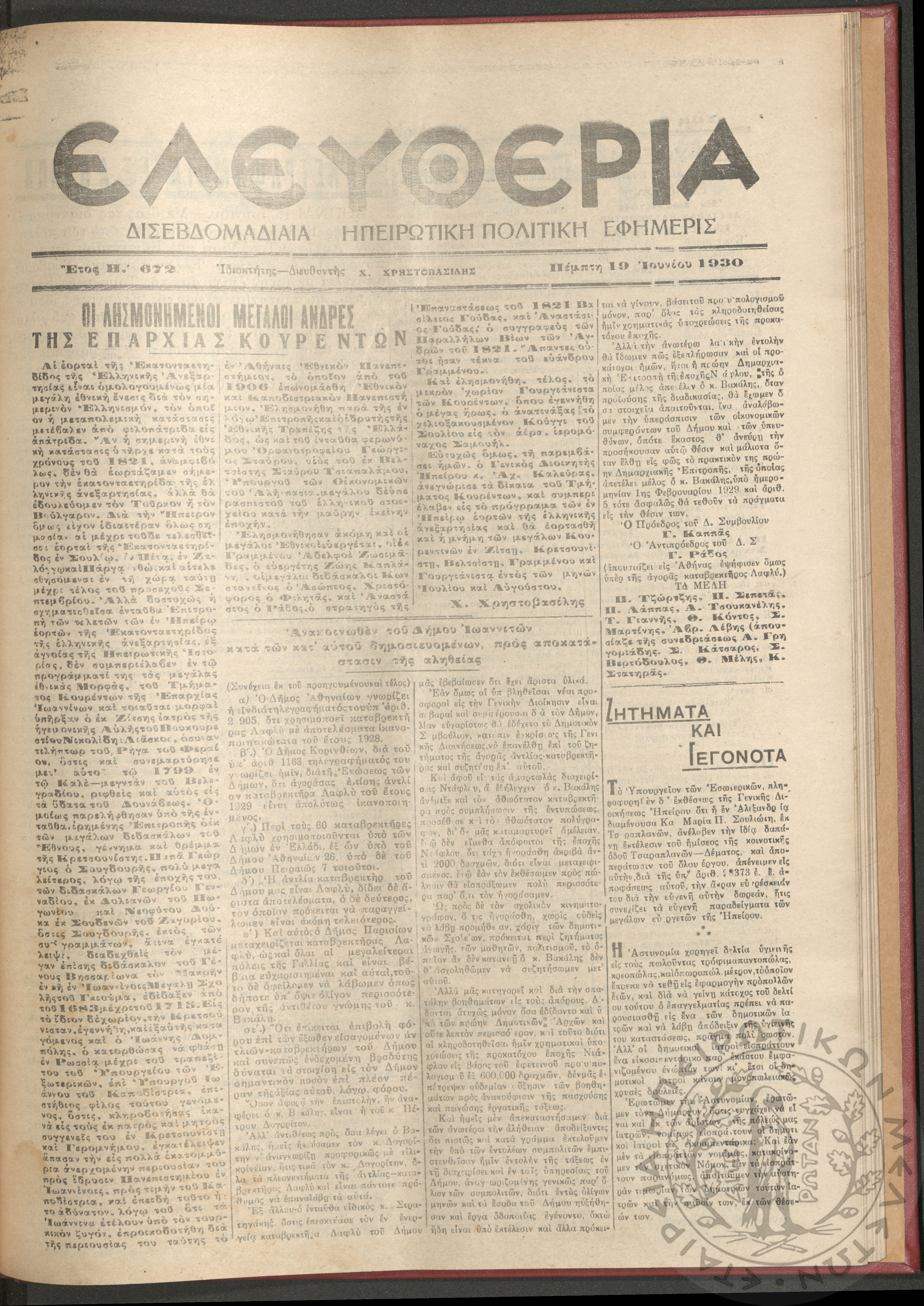 Ελευθερία: δισεβδομαδιαία Ηπειρωτική πολιτική εφημερίς, 1930, φ. 672