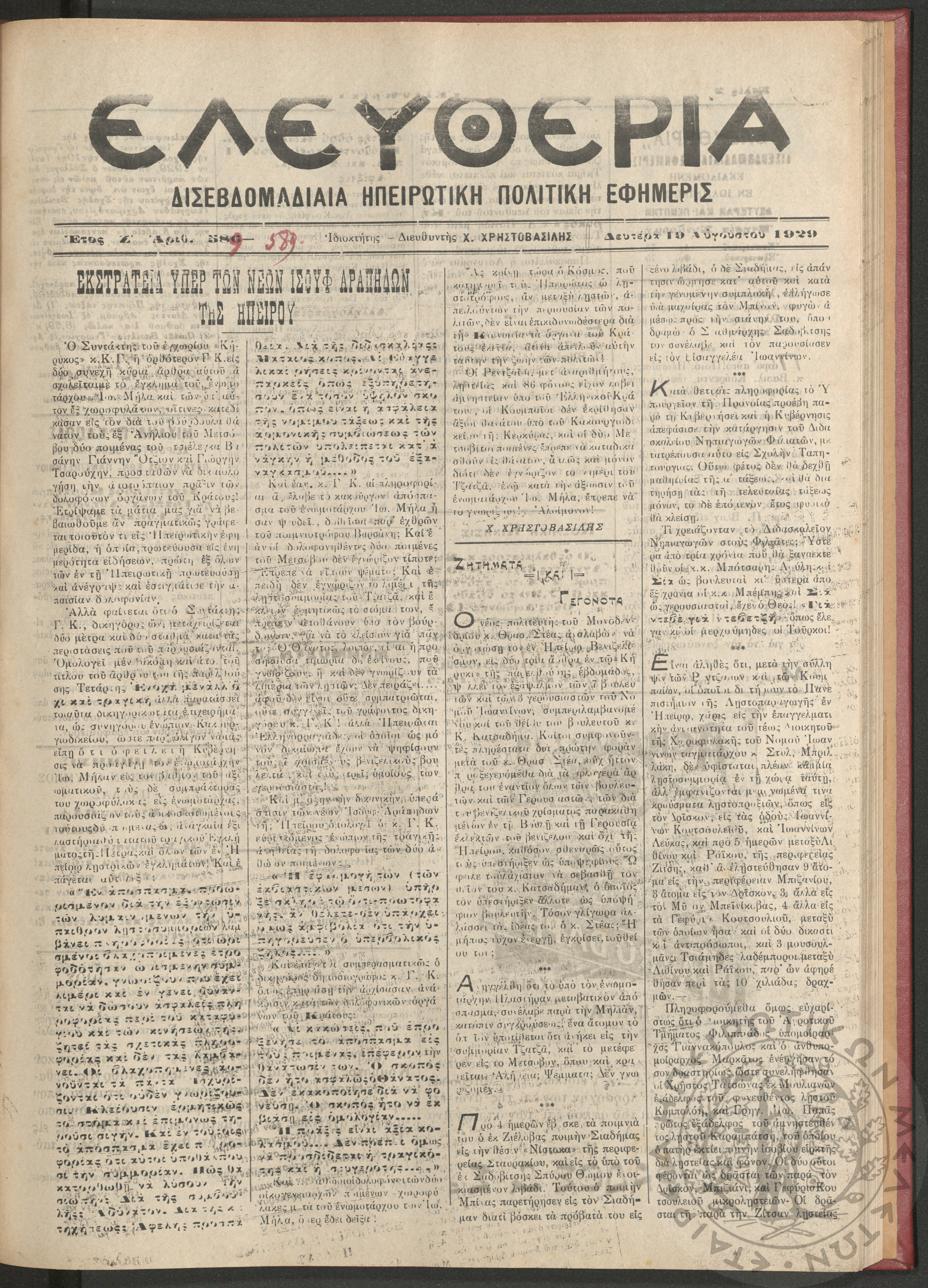 Ελευθερία: δισεβδομαδιαία Ηπειρωτική πολιτική εφημερίς, 1929, φ. 589
