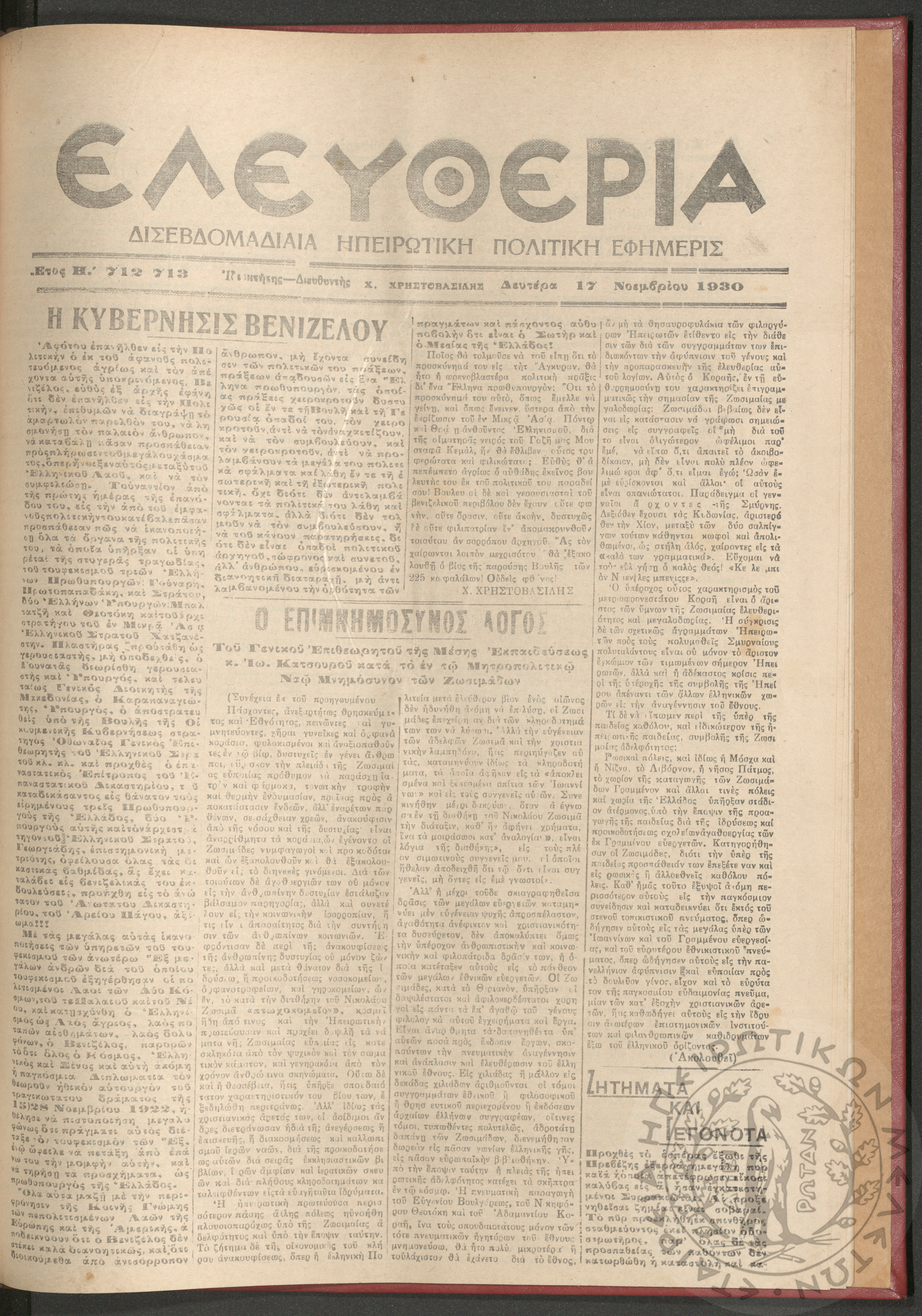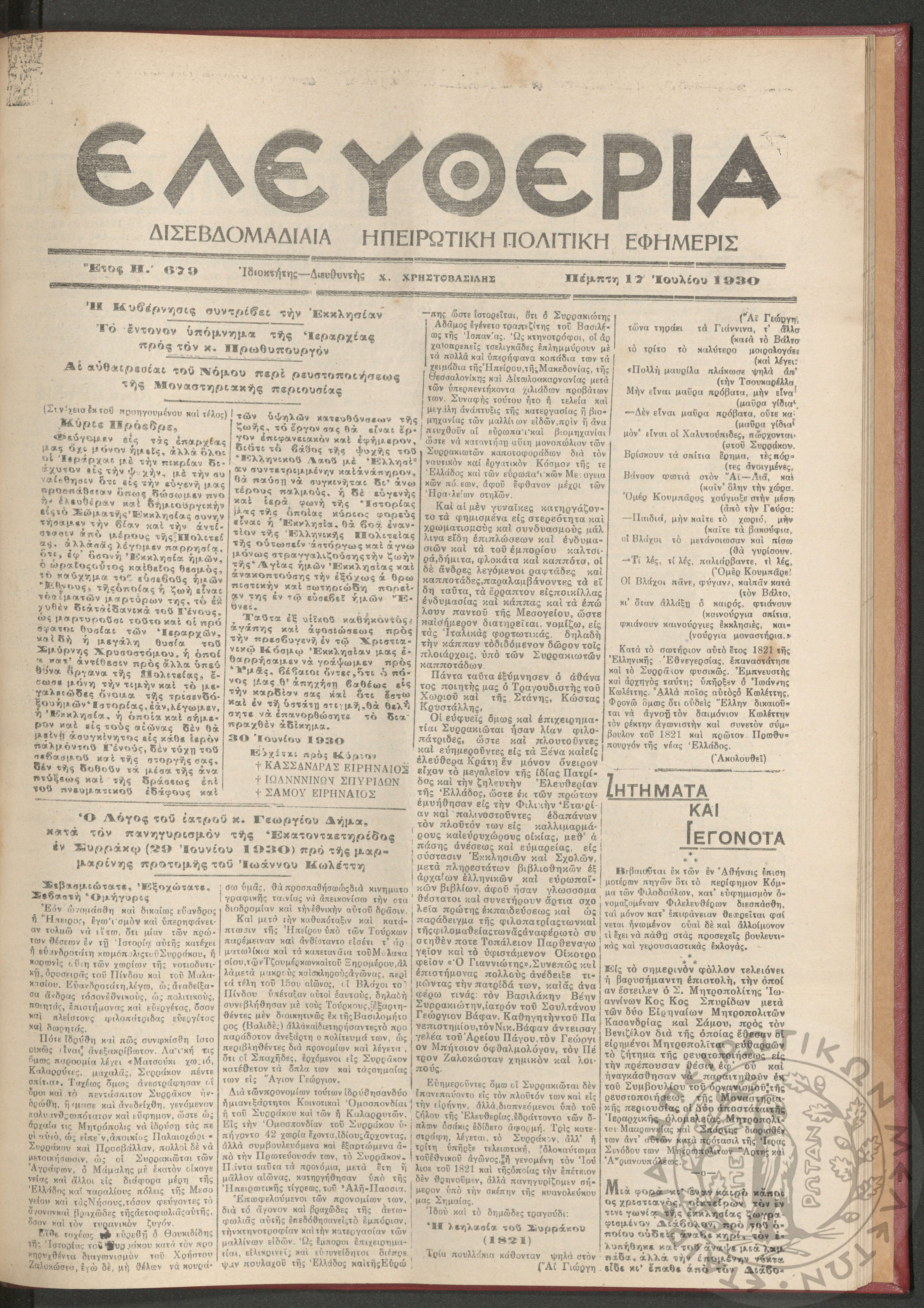 Ελευθερία: δισεβδομαδιαία Ηπειρωτική πολιτική εφημερίς, 1930, φ. 679