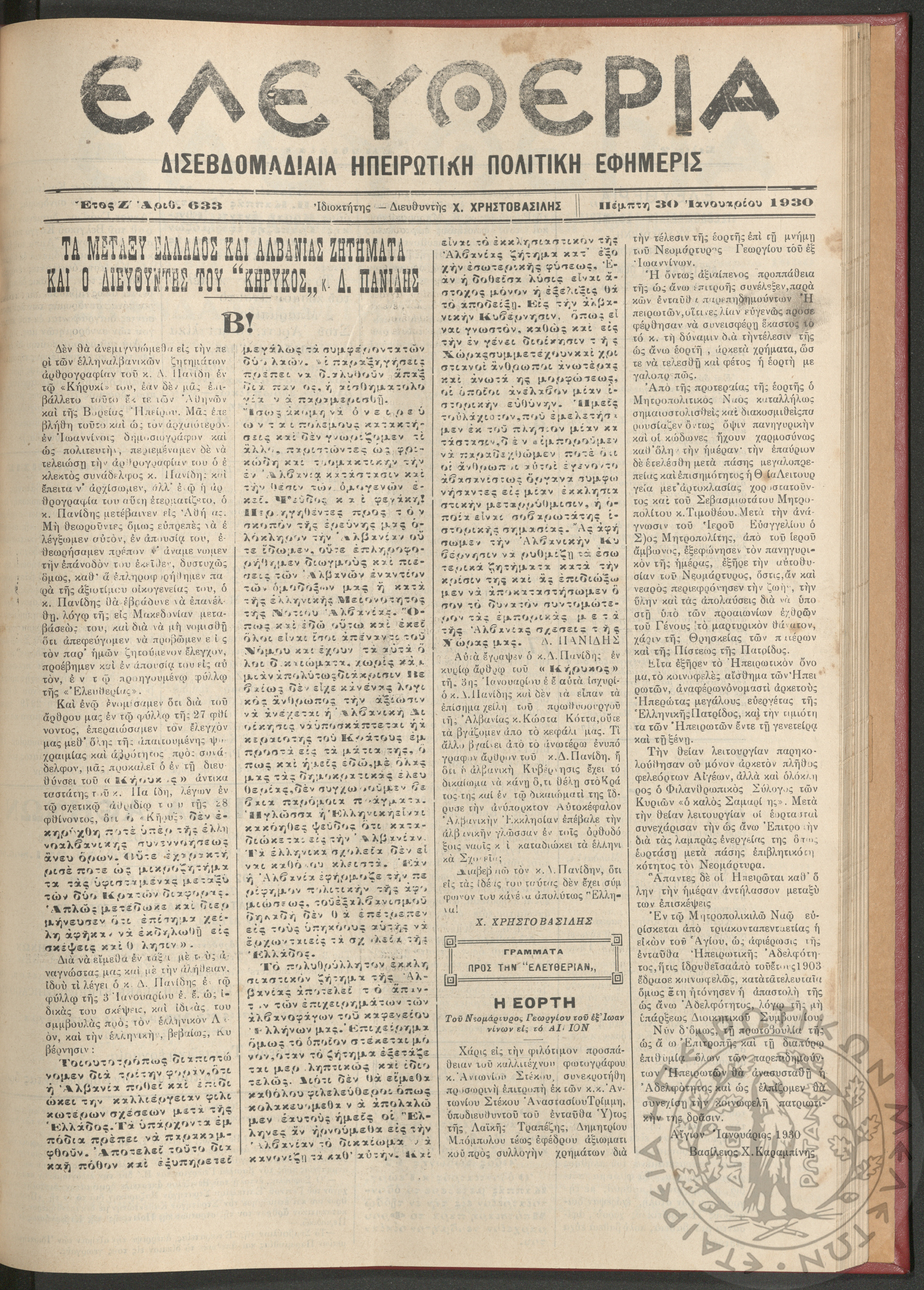 Ελευθερία: δισεβδομαδιαία Ηπειρωτική πολιτική εφημερίς, 1930, φ. 633