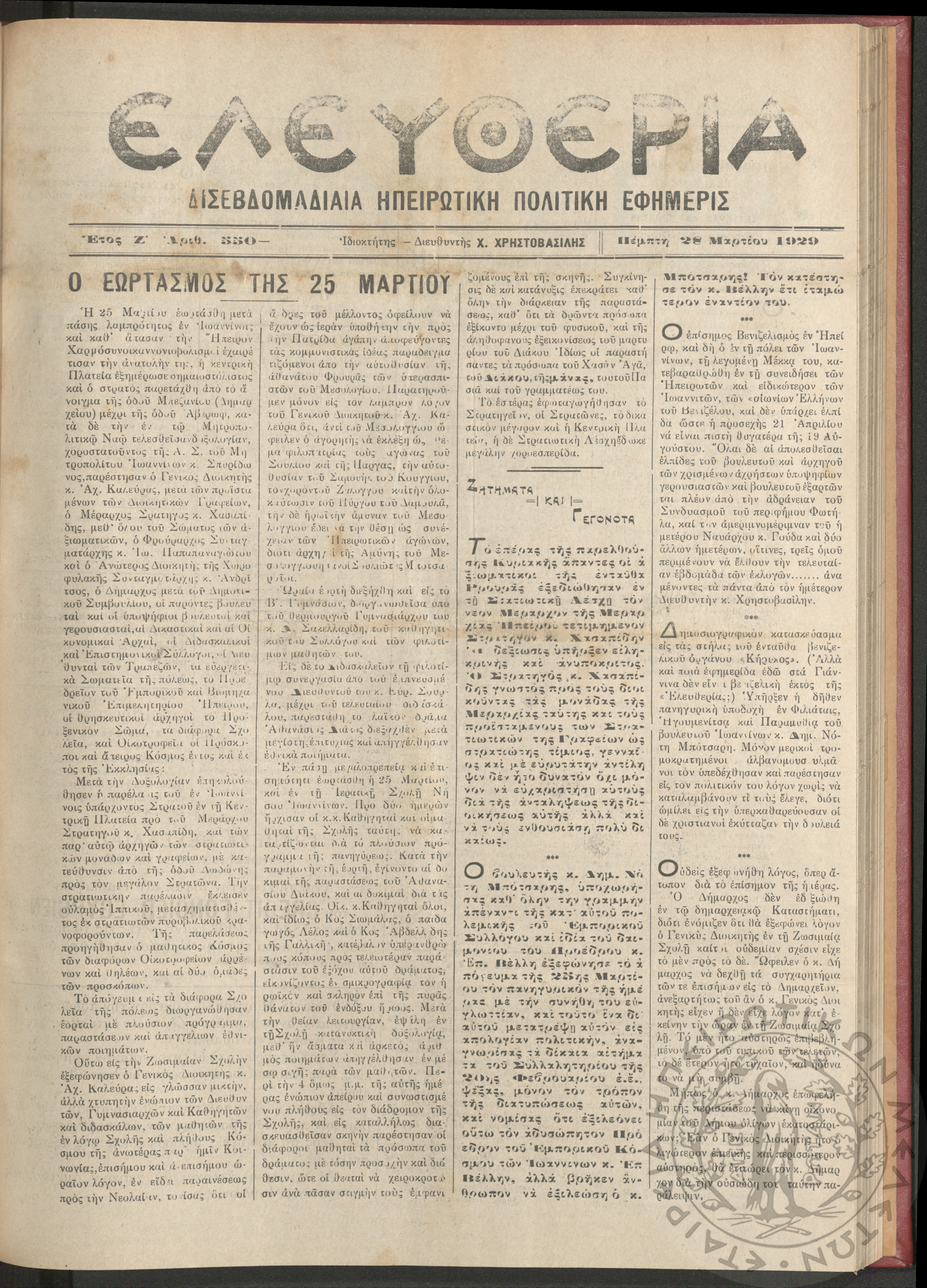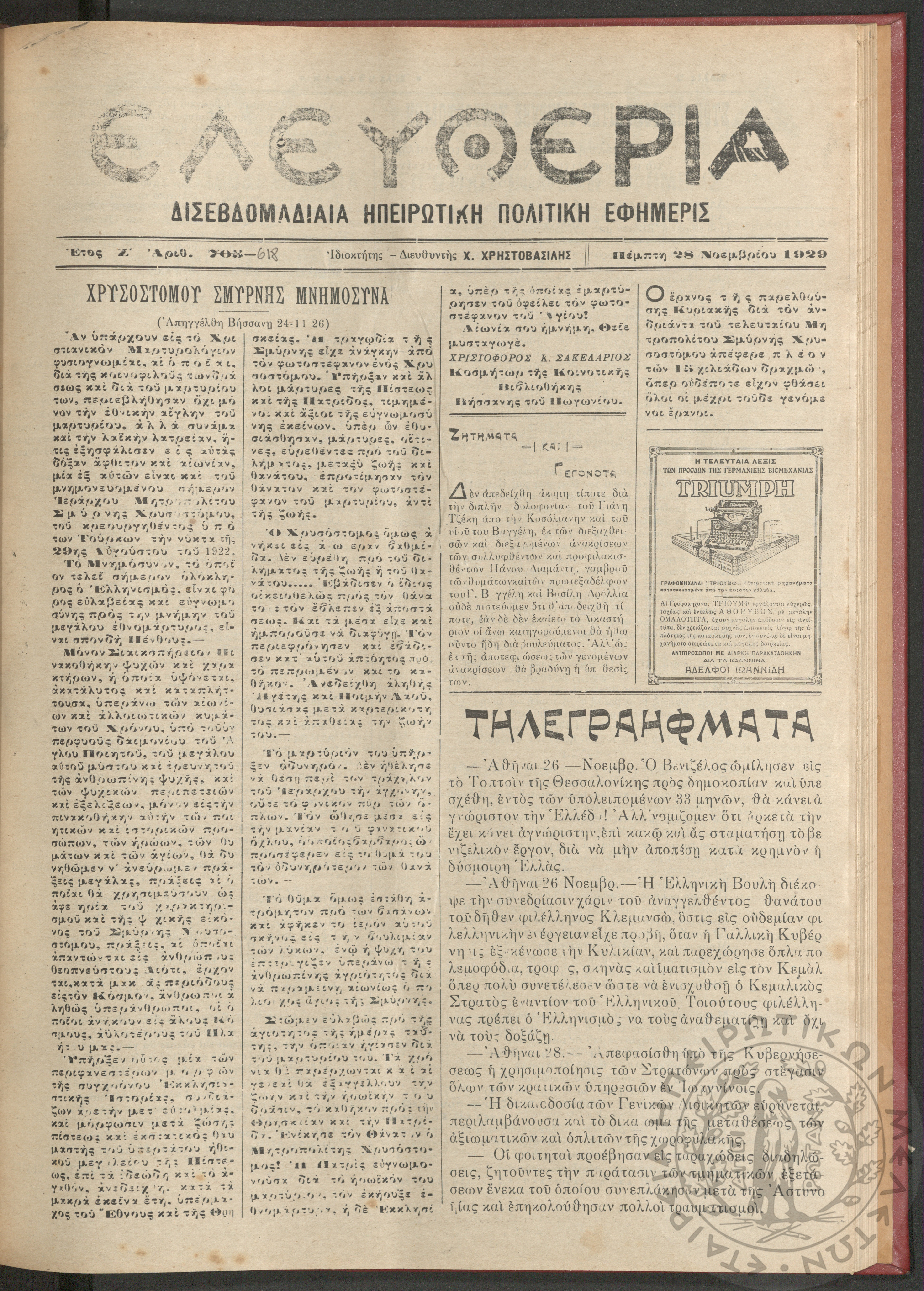 Ελευθερία: δισεβδομαδιαία Ηπειρωτική πολιτική εφημερίς, 1929, φ. 550