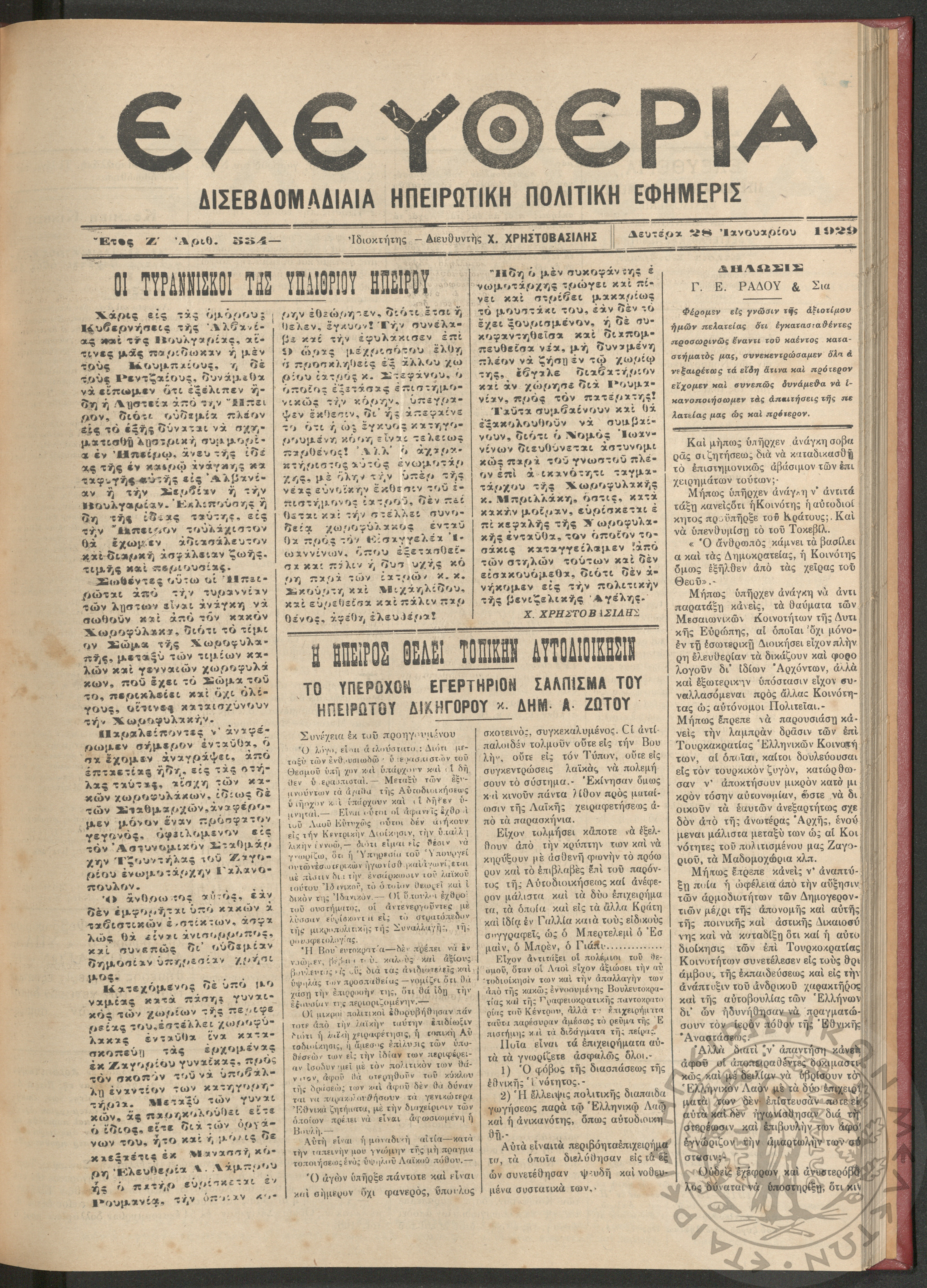 Ελευθερία: δισεβδομαδιαία Ηπειρωτική πολιτική εφημερίς, 1929, φ. 534