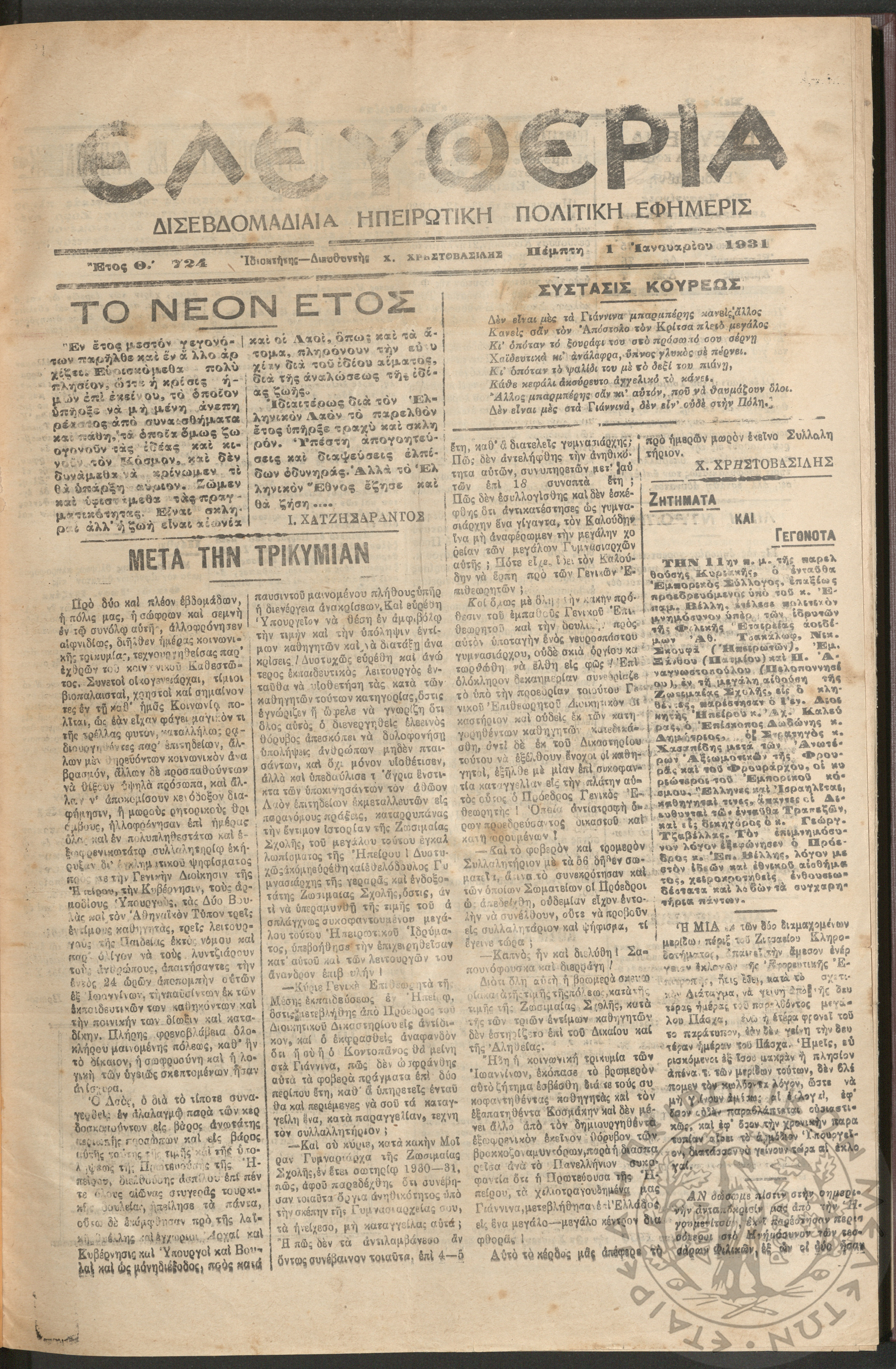 Ελευθερία: δισεβδομαδιαία Ηπειρωτική πολιτική εφημερίς, 1931, φ. 724