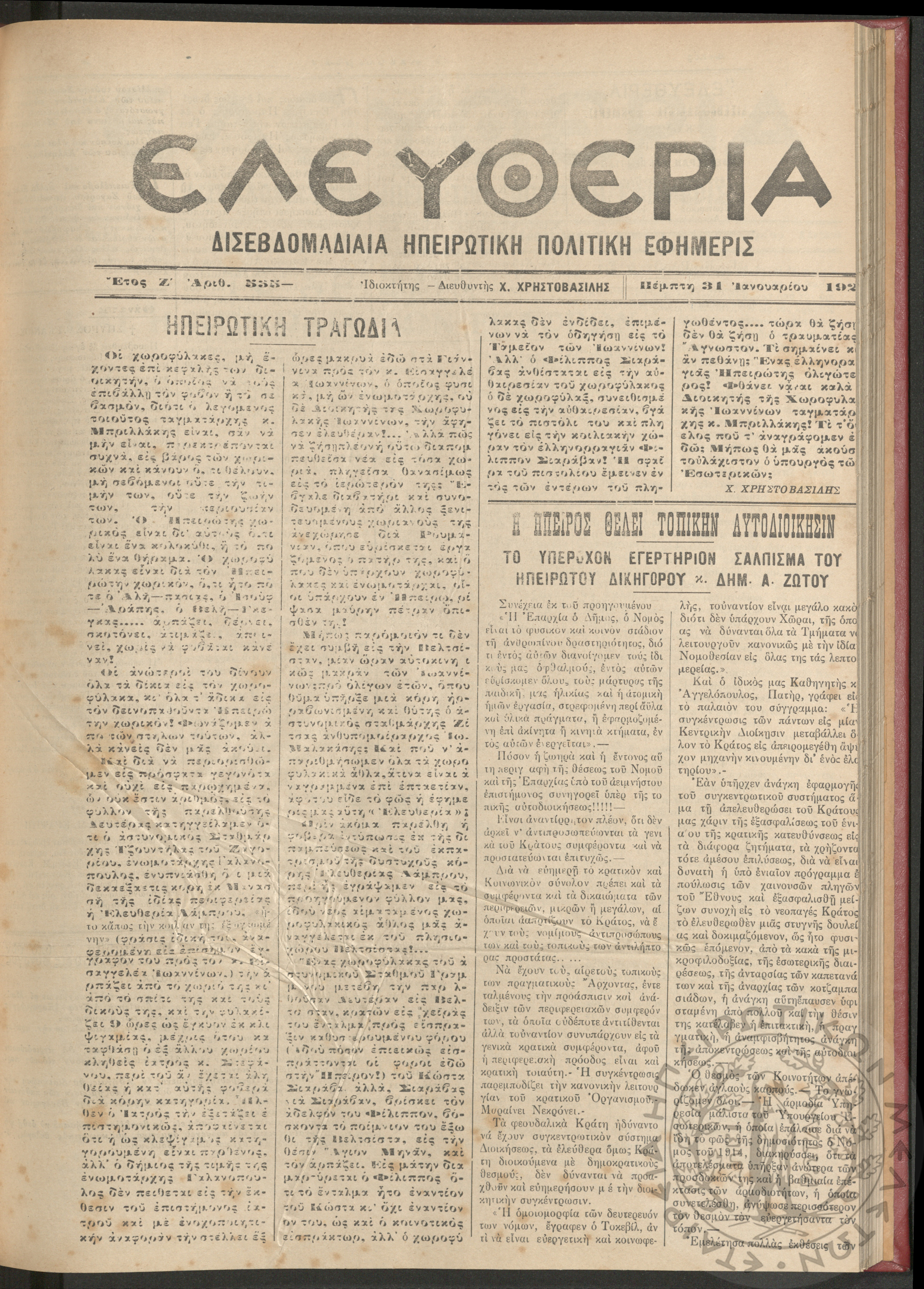 Ελευθερία: δισεβδομαδιαία Ηπειρωτική πολιτική εφημερίς, 1929, φ. 592