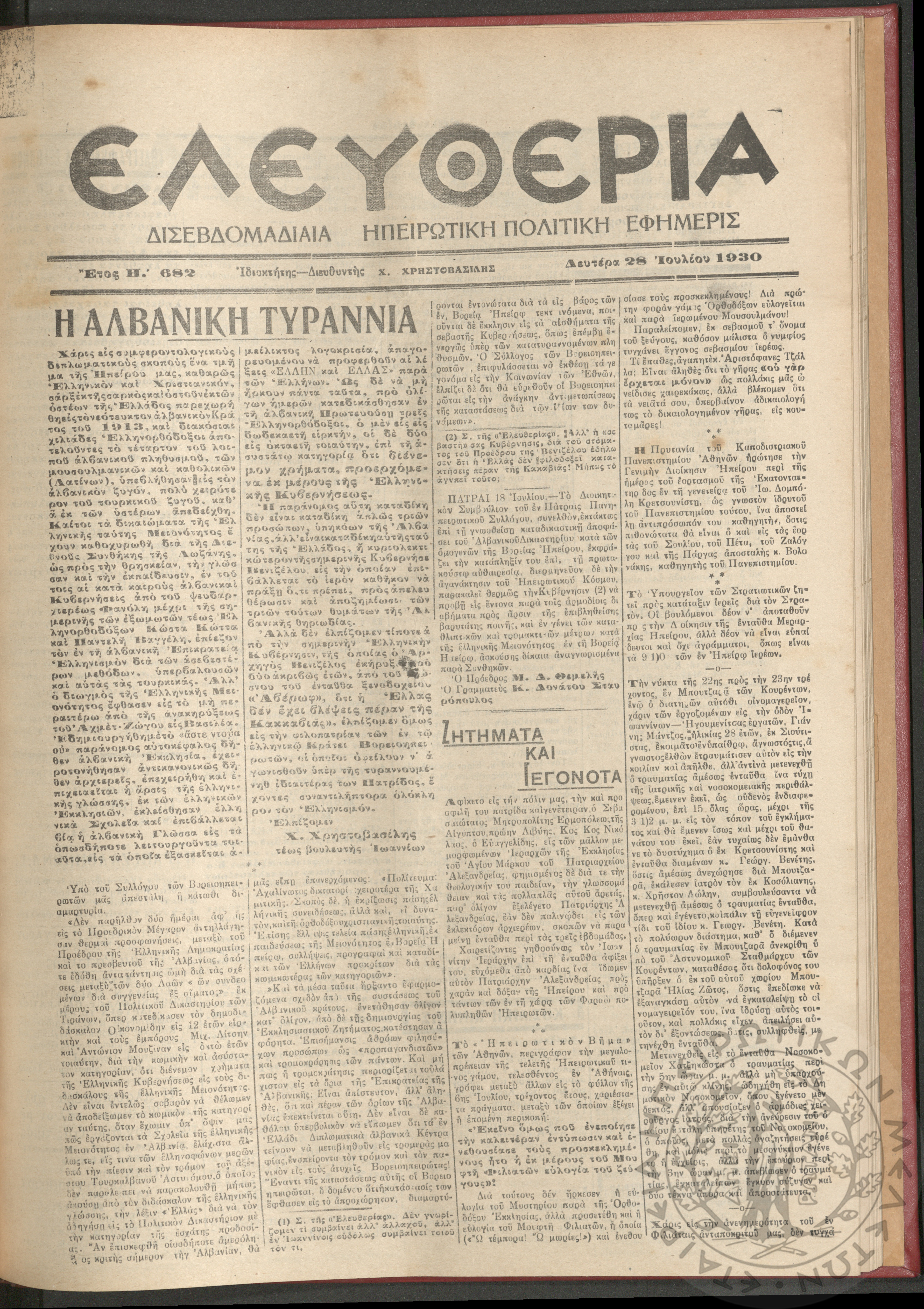 Ελευθερία: δισεβδομαδιαία Ηπειρωτική πολιτική εφημερίς, 1930, φ. 650