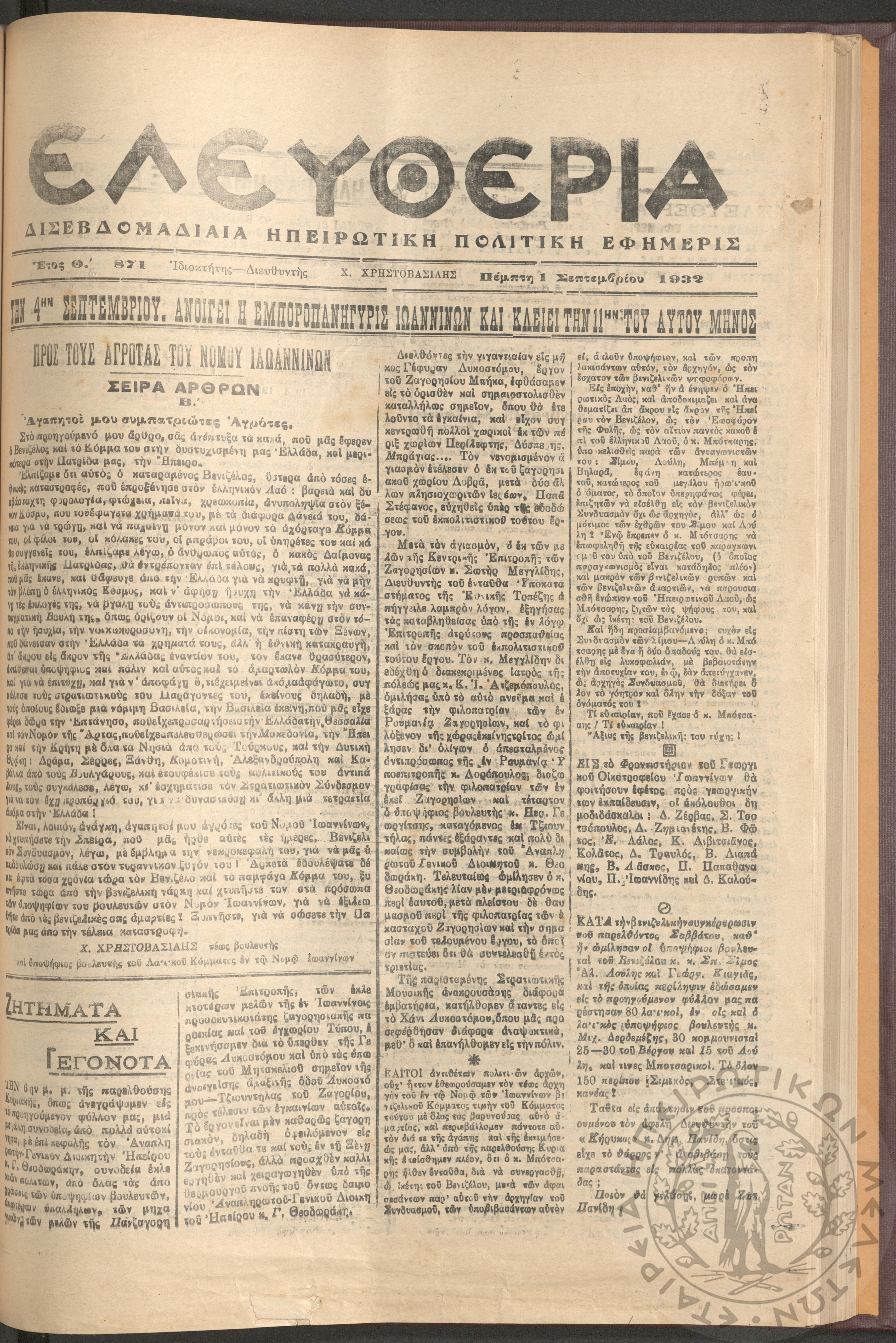 Ελευθερία: δισεβδομαδιαία Ηπειρωτική πολιτική εφημερίς, 1932, φ. 871