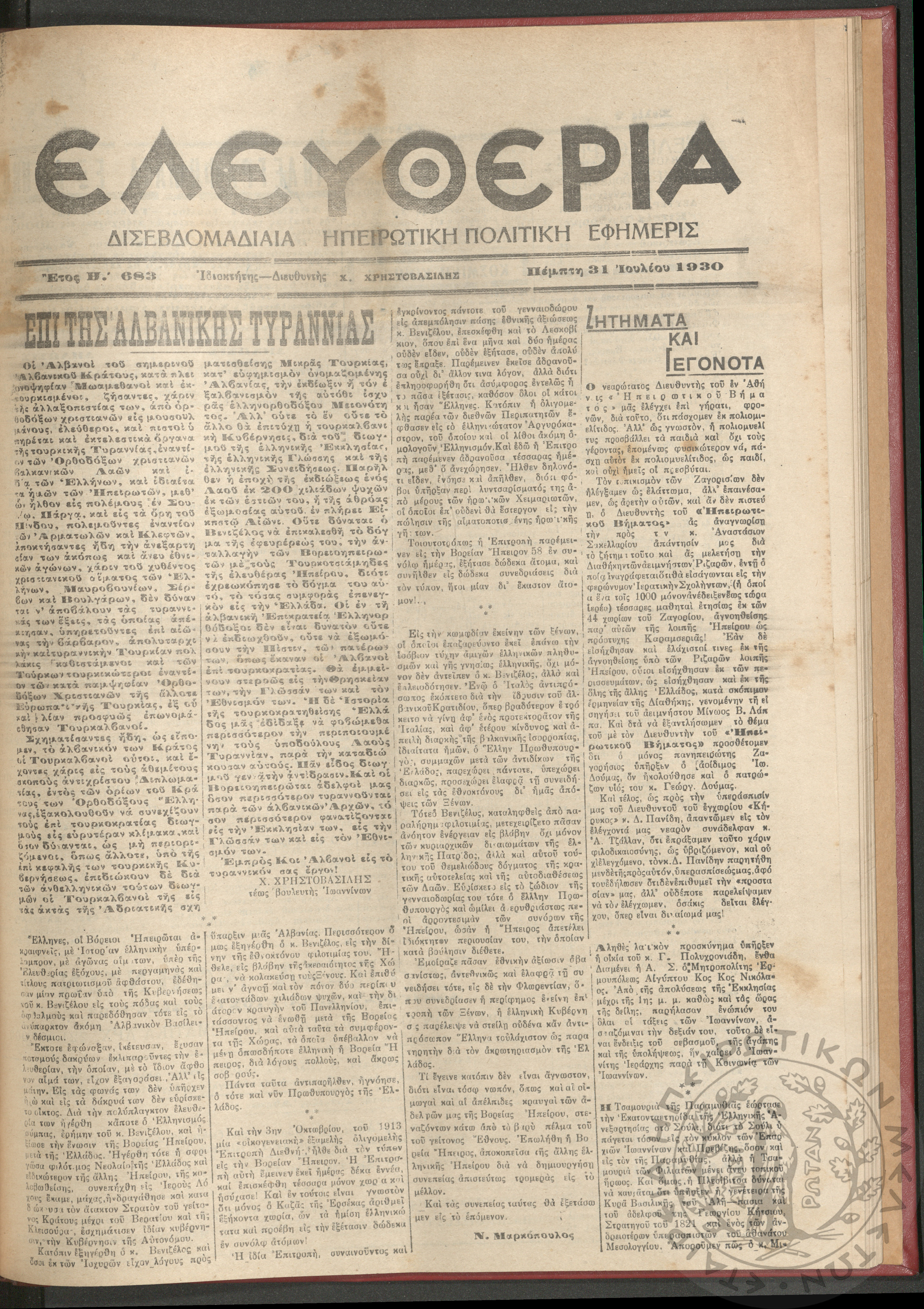 Ελευθερία: δισεβδομαδιαία Ηπειρωτική πολιτική εφημερίς, 1930, φ. 683