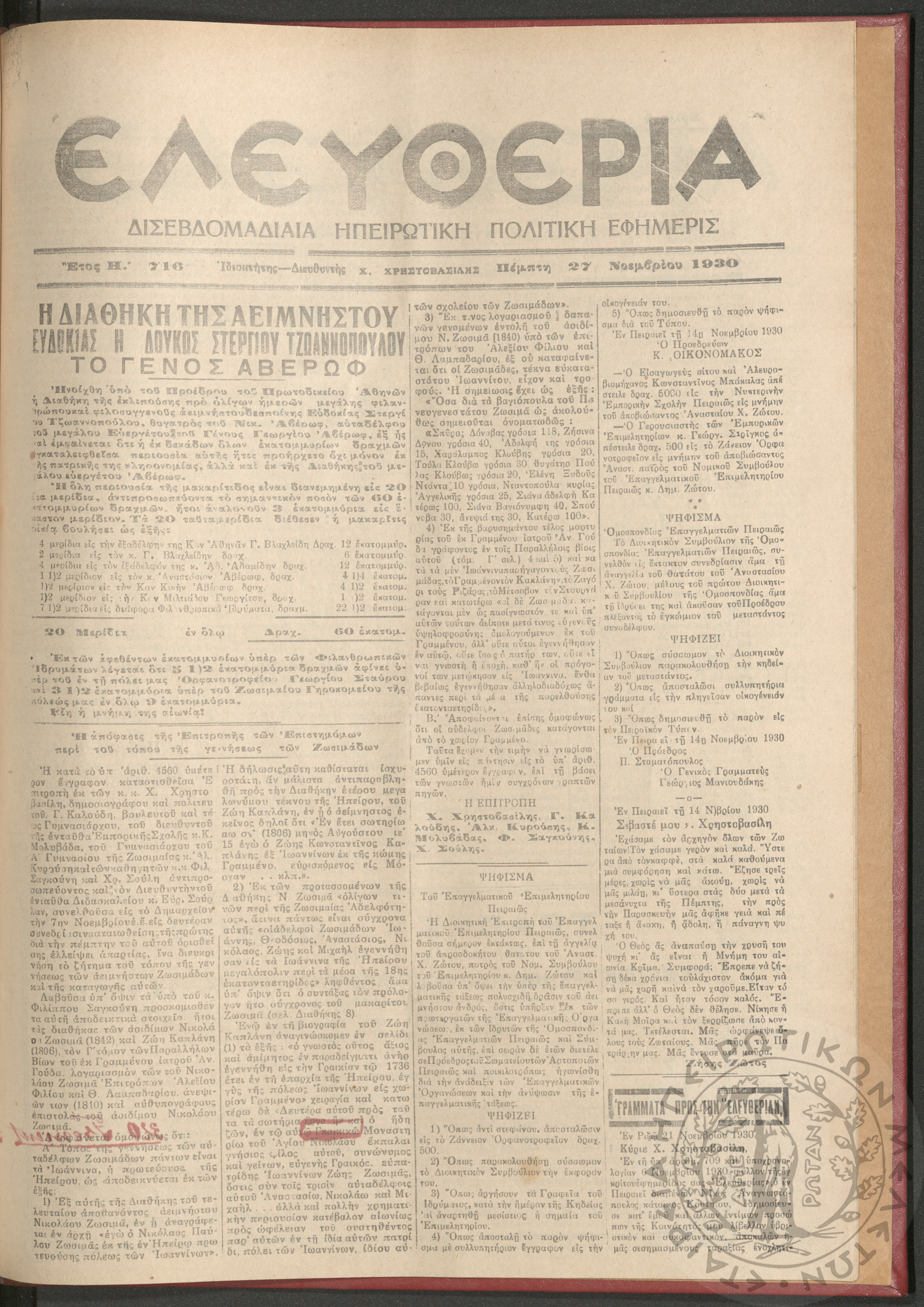 Ελευθερία: δισεβδομαδιαία Ηπειρωτική πολιτική εφημερίς, 1930, φ. 716