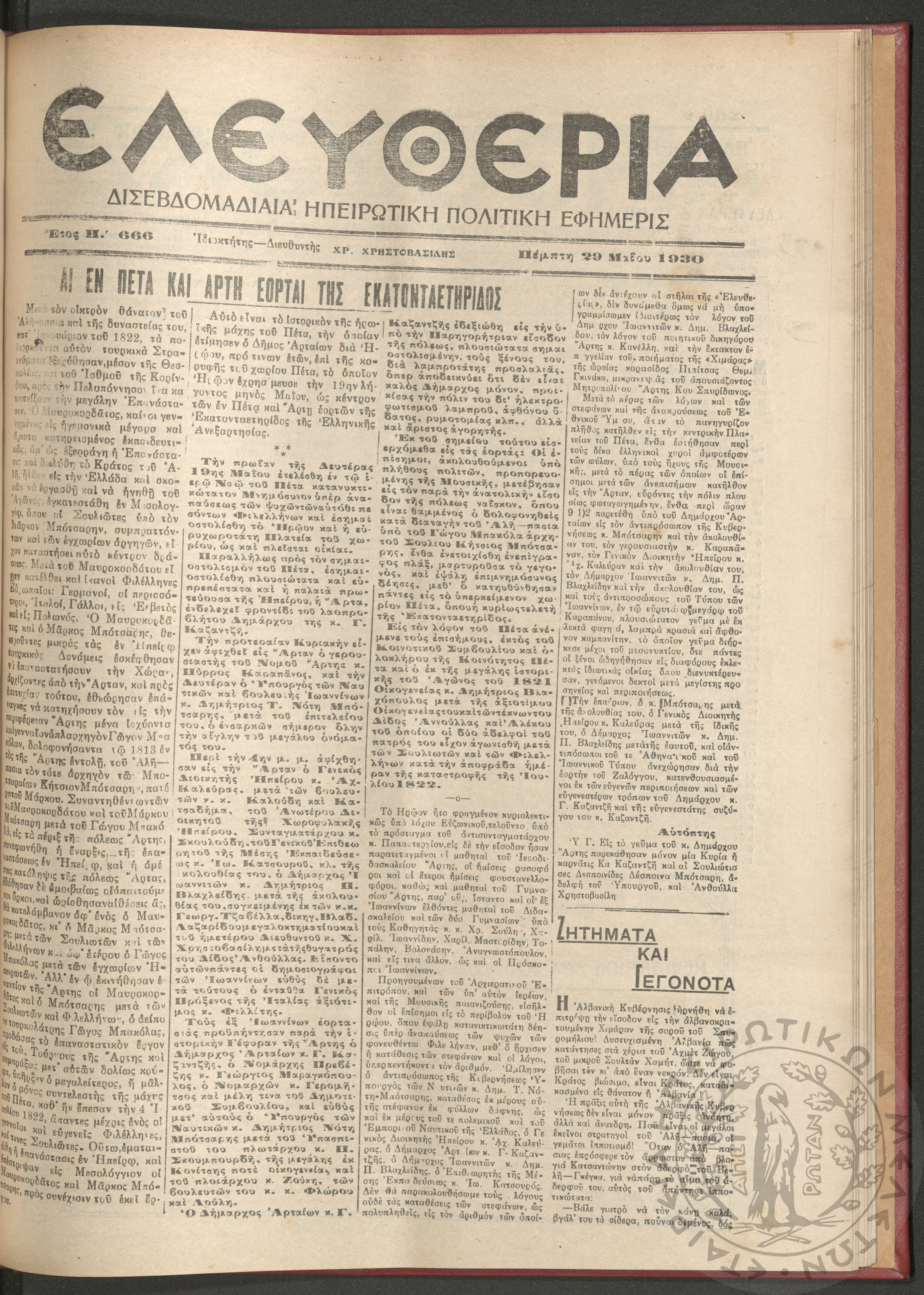 Ελευθερία: δισεβδομαδιαία Ηπειρωτική πολιτική εφημερίς, 1930, φ. 666