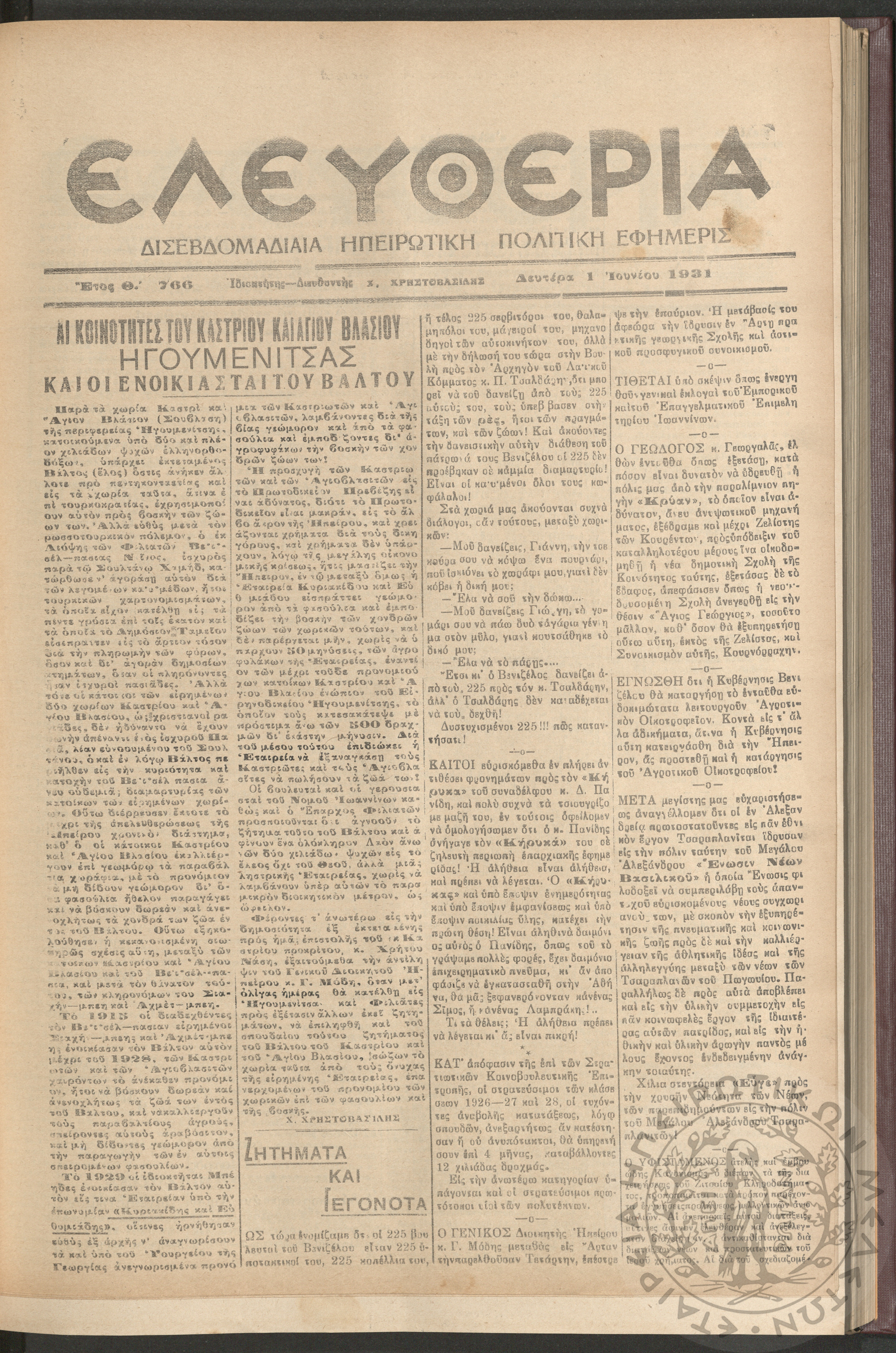 Ελευθερία: δισεβδομαδιαία Ηπειρωτική πολιτική εφημερίς, 1931, φ. 766