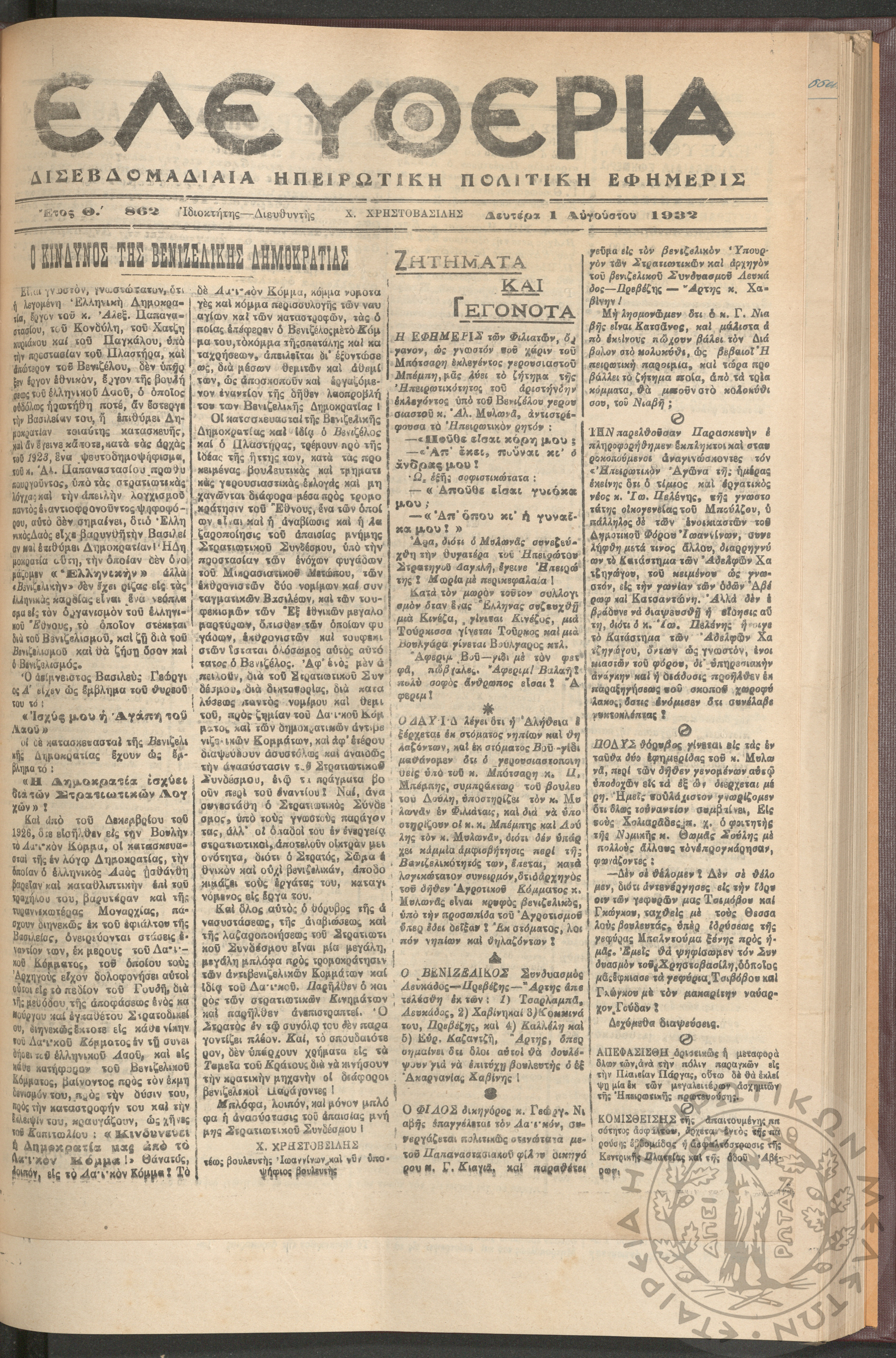 Ελευθερία: δισεβδομαδιαία Ηπειρωτική πολιτική εφημερίς, 1932, φ. 862