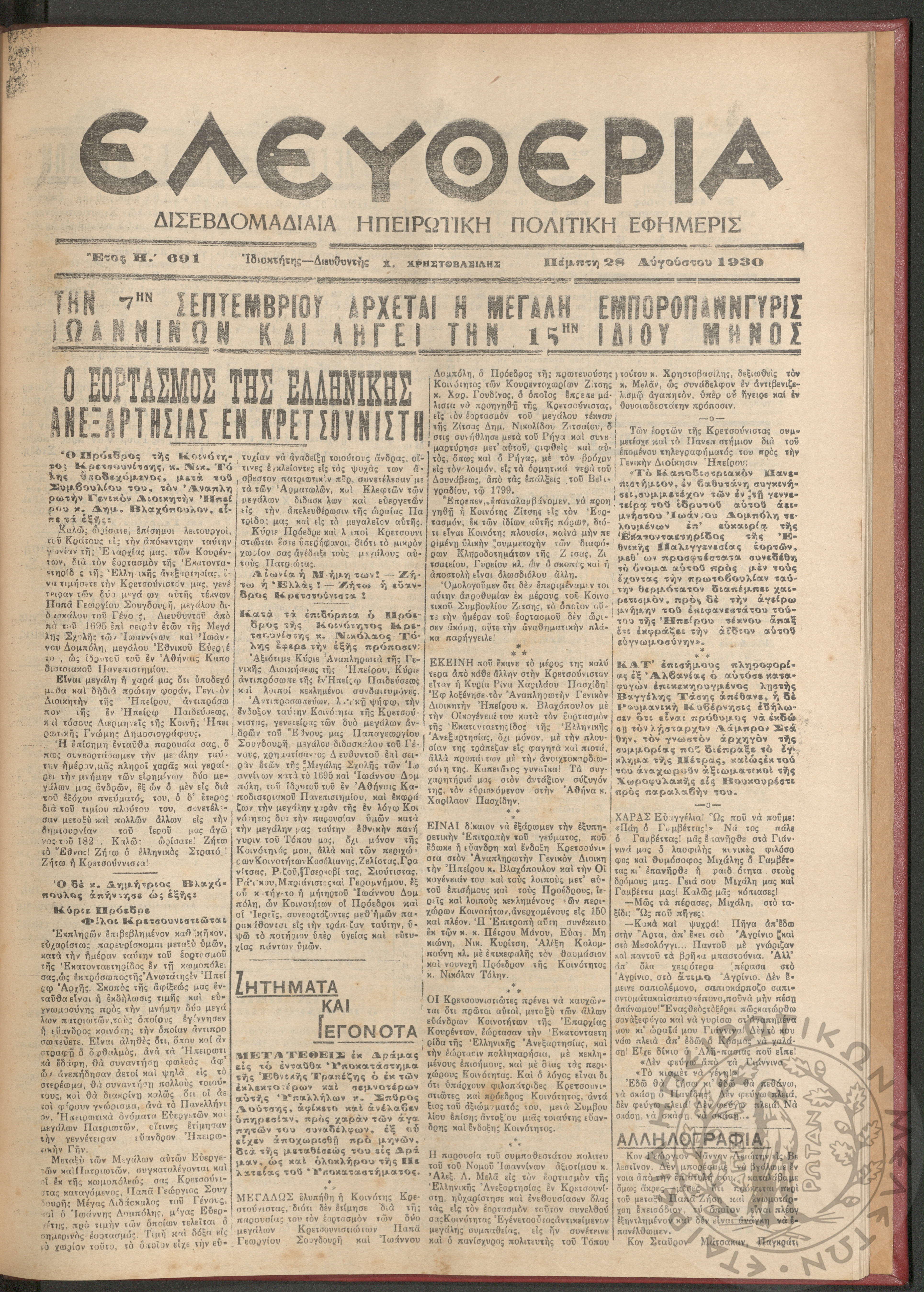 Ελευθερία: δισεβδομαδιαία Ηπειρωτική πολιτική εφημερίς, 1930, φ. 691