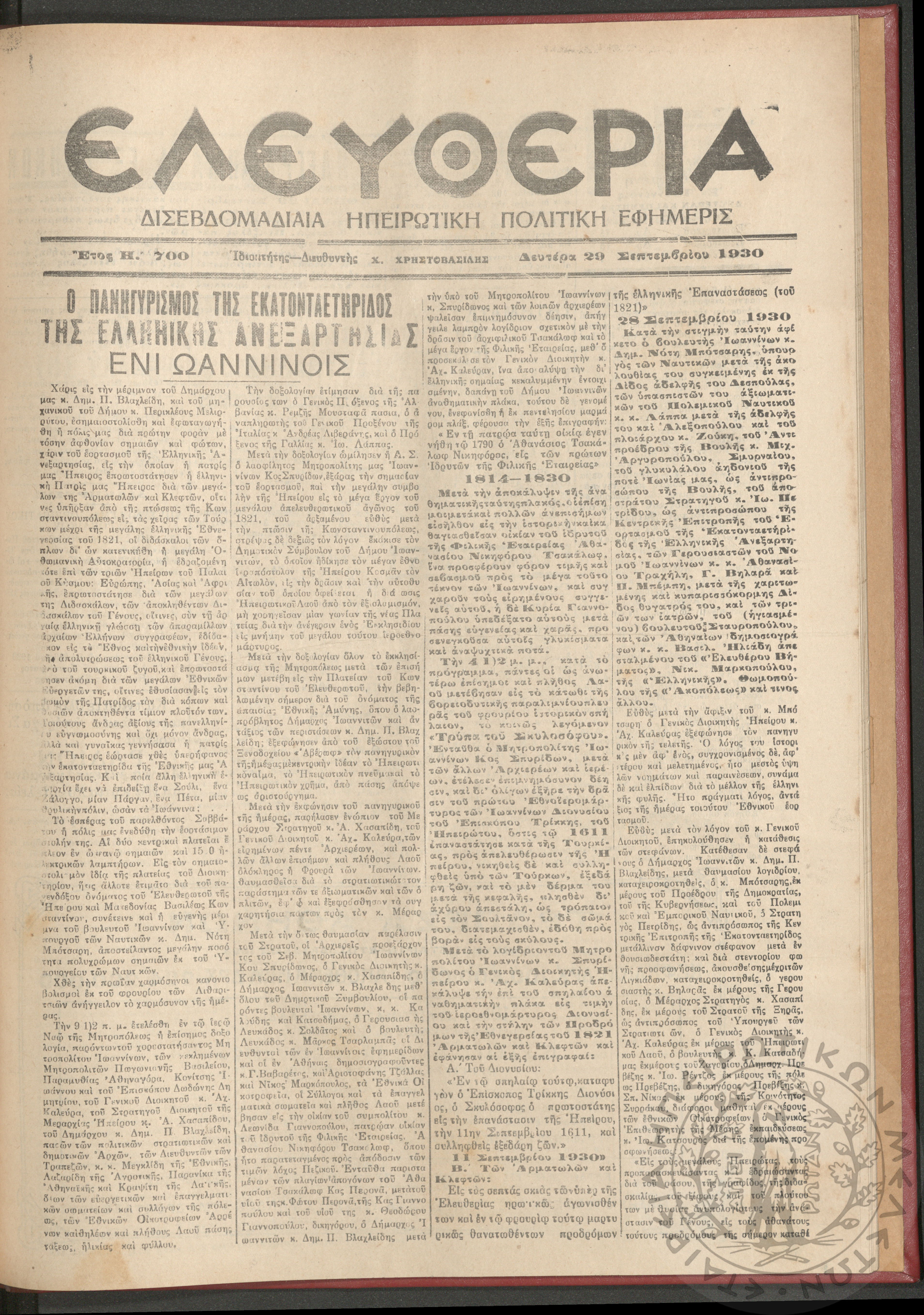 Ελευθερία: δισεβδομαδιαία Ηπειρωτική πολιτική εφημερίς, 1930, φ. 700