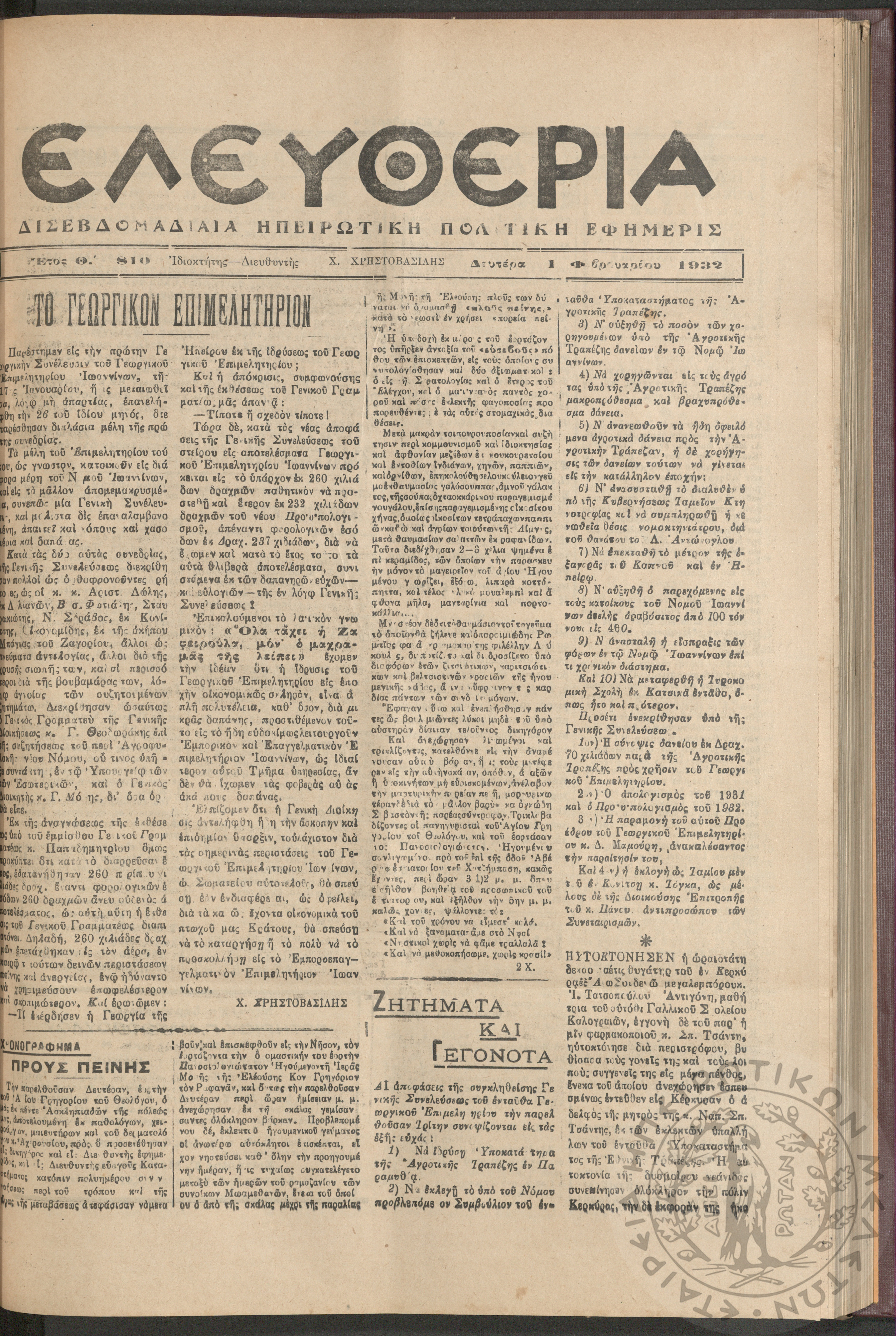 Ελευθερία: δισεβδομαδιαία Ηπειρωτική πολιτική εφημερίς, 1932, φ. 810