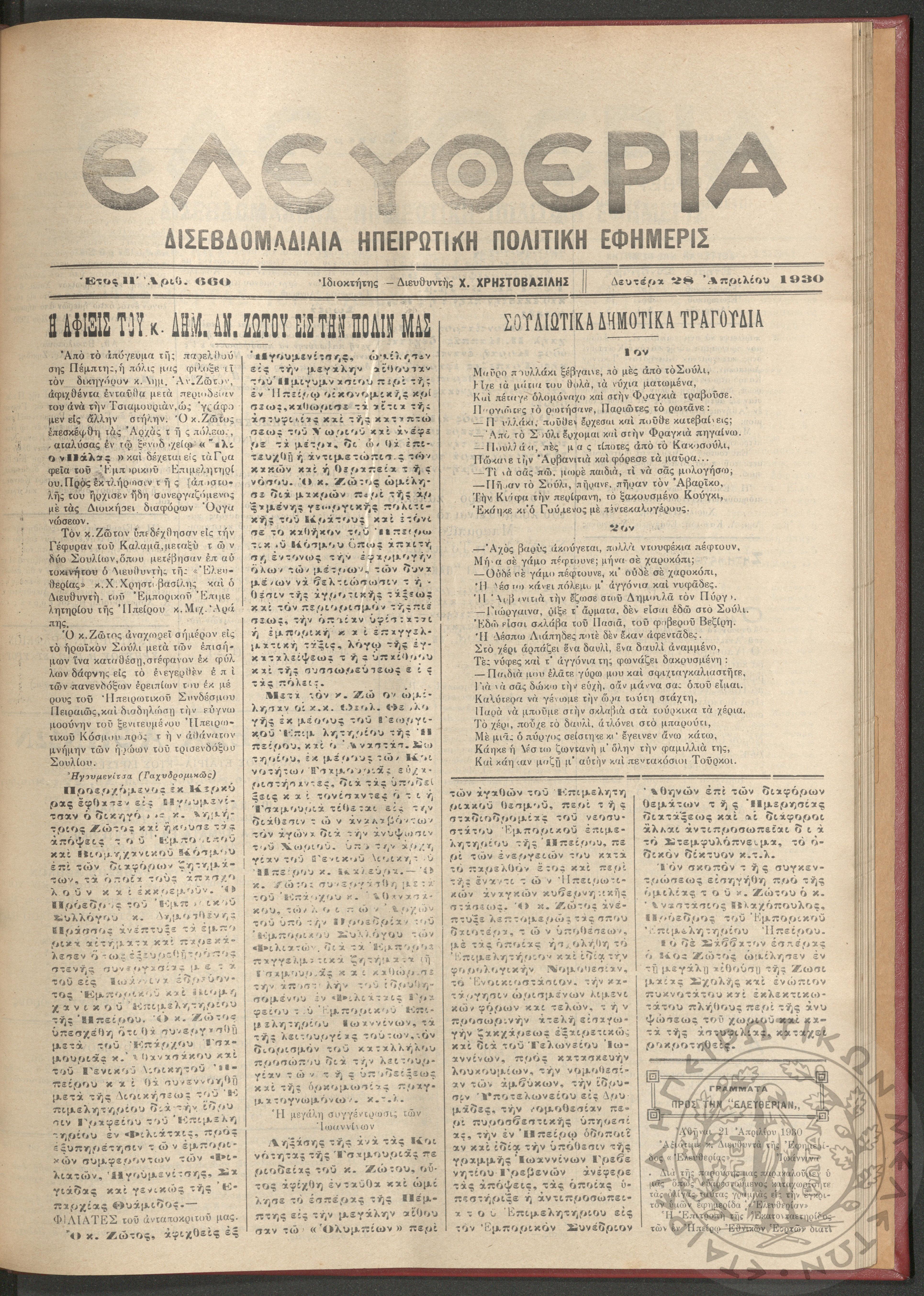 Ελευθερία: δισεβδομαδιαία Ηπειρωτική πολιτική εφημερίς, 1930, φ. 660