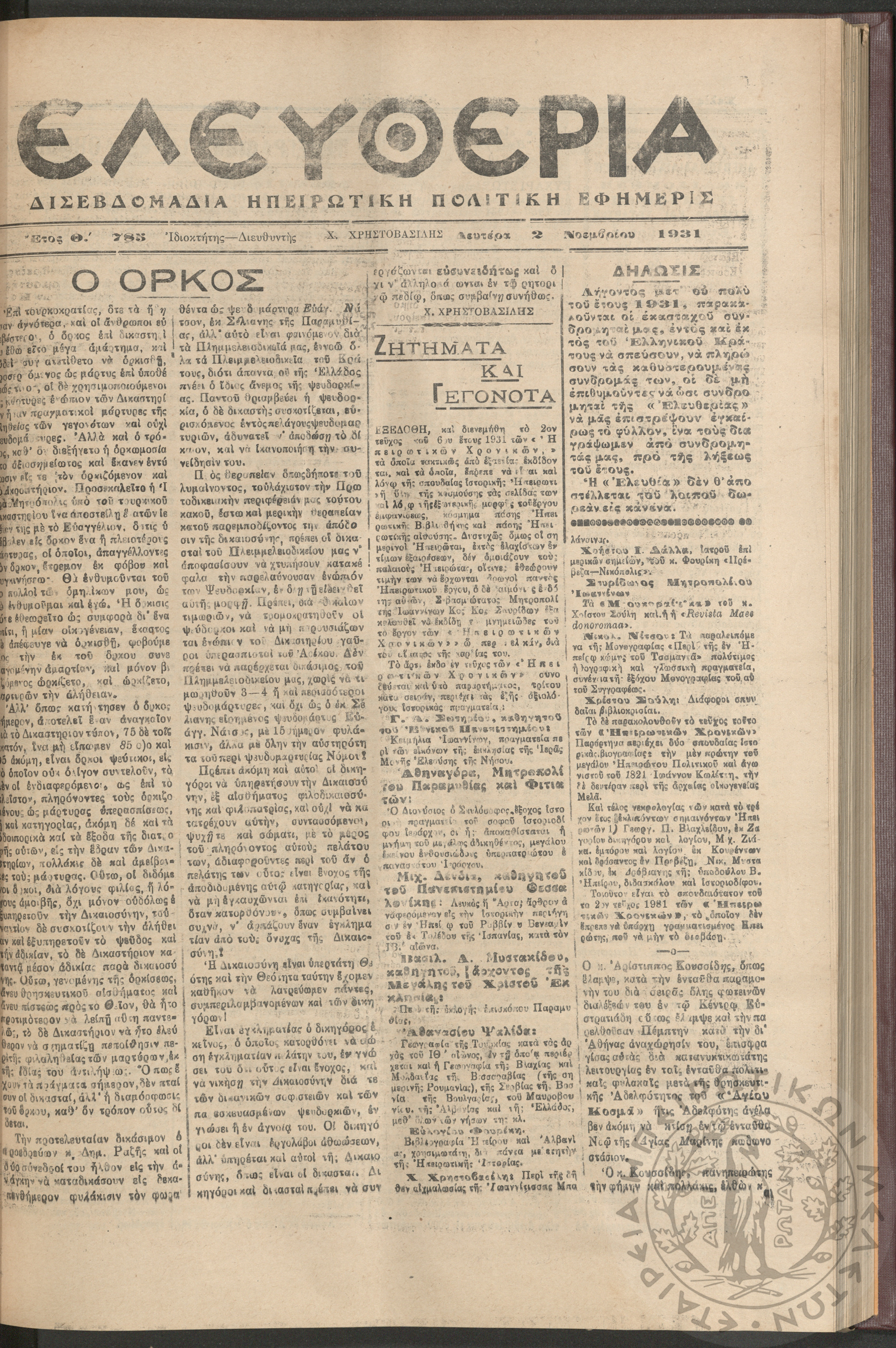 Ελευθερία: δισεβδομαδιαία Ηπειρωτική πολιτική εφημερίς, 1931, φ. 785