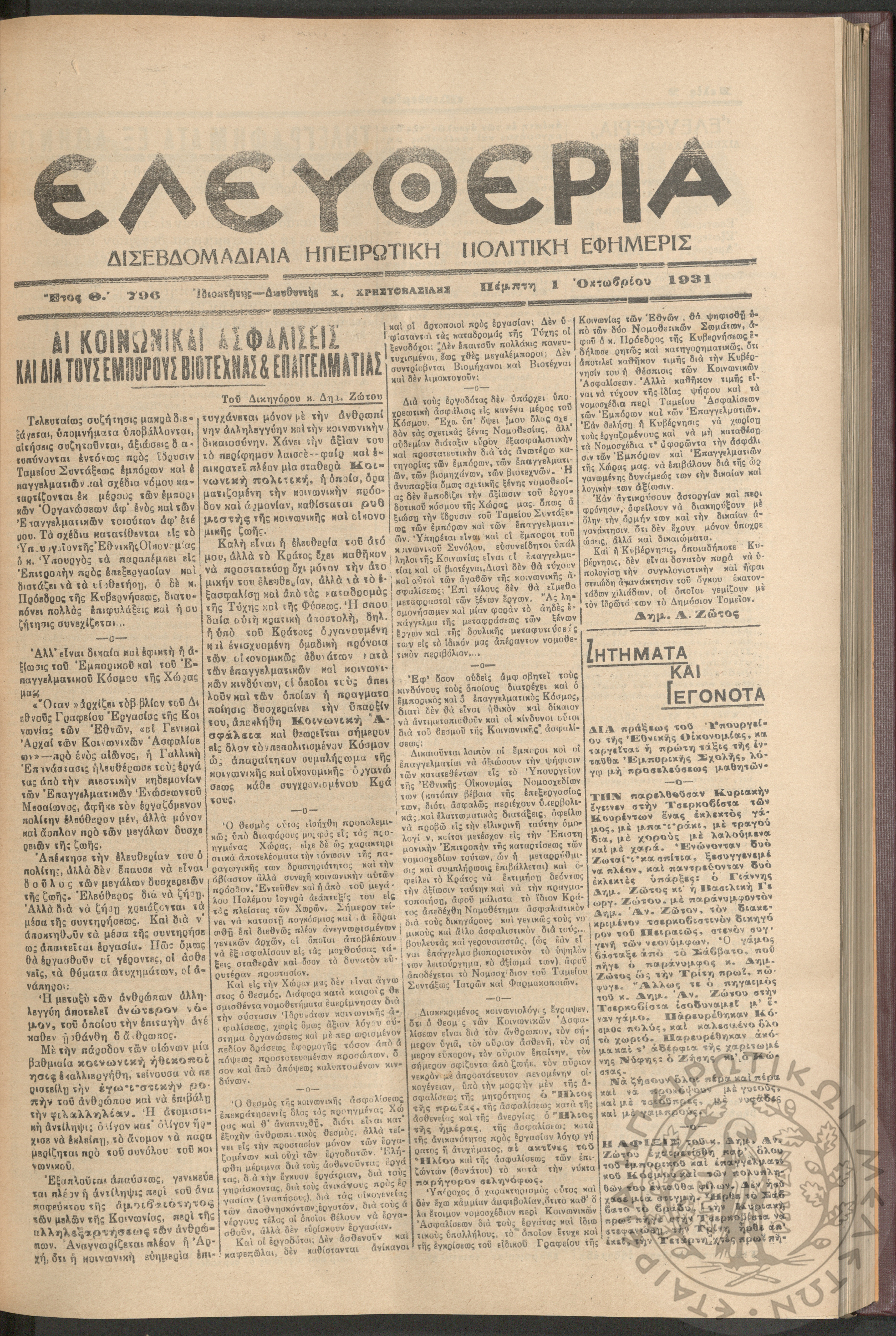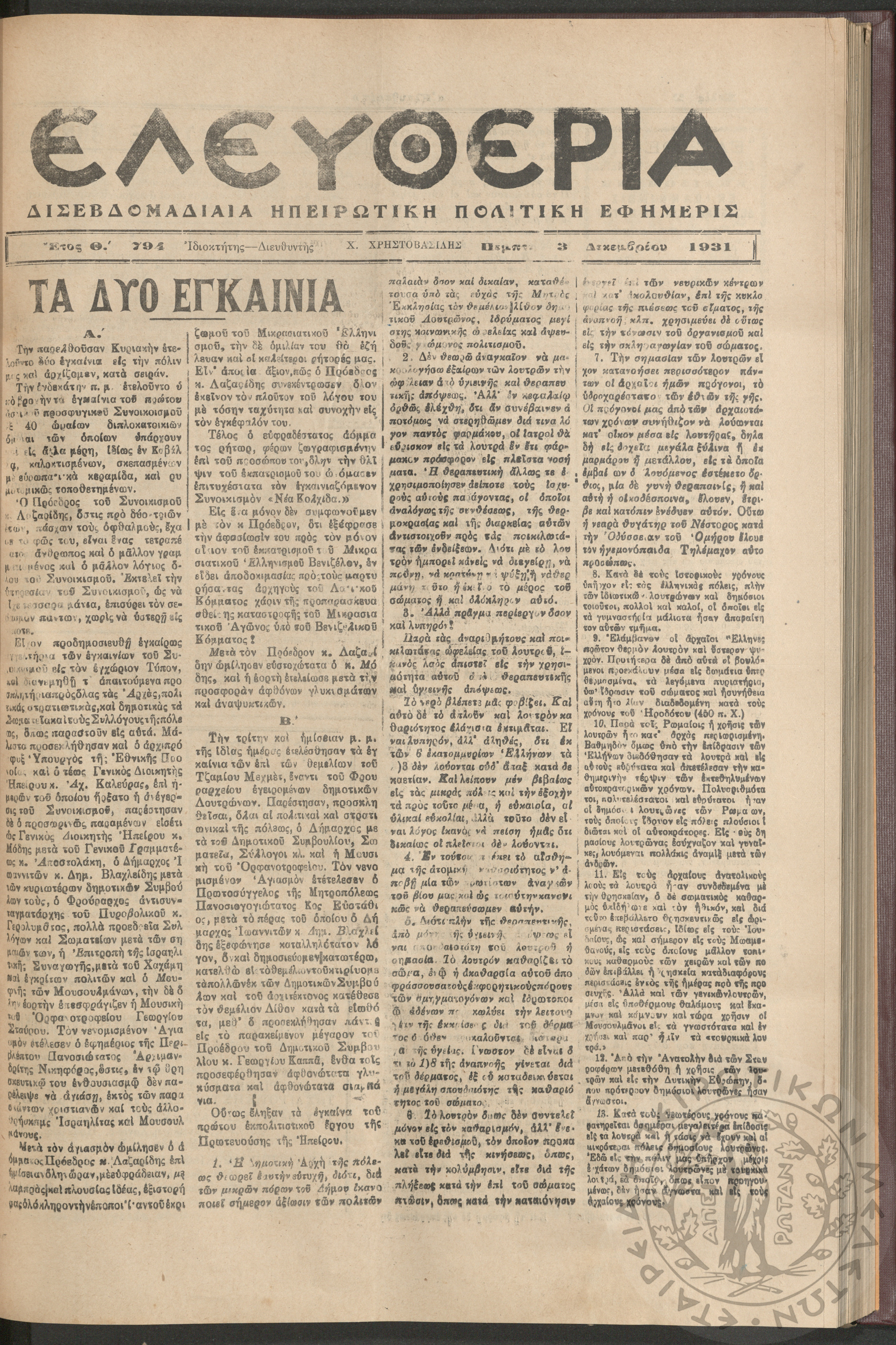 Ελευθερία: δισεβδομαδιαία Ηπειρωτική πολιτική εφημερίς, 1931, φ. 796