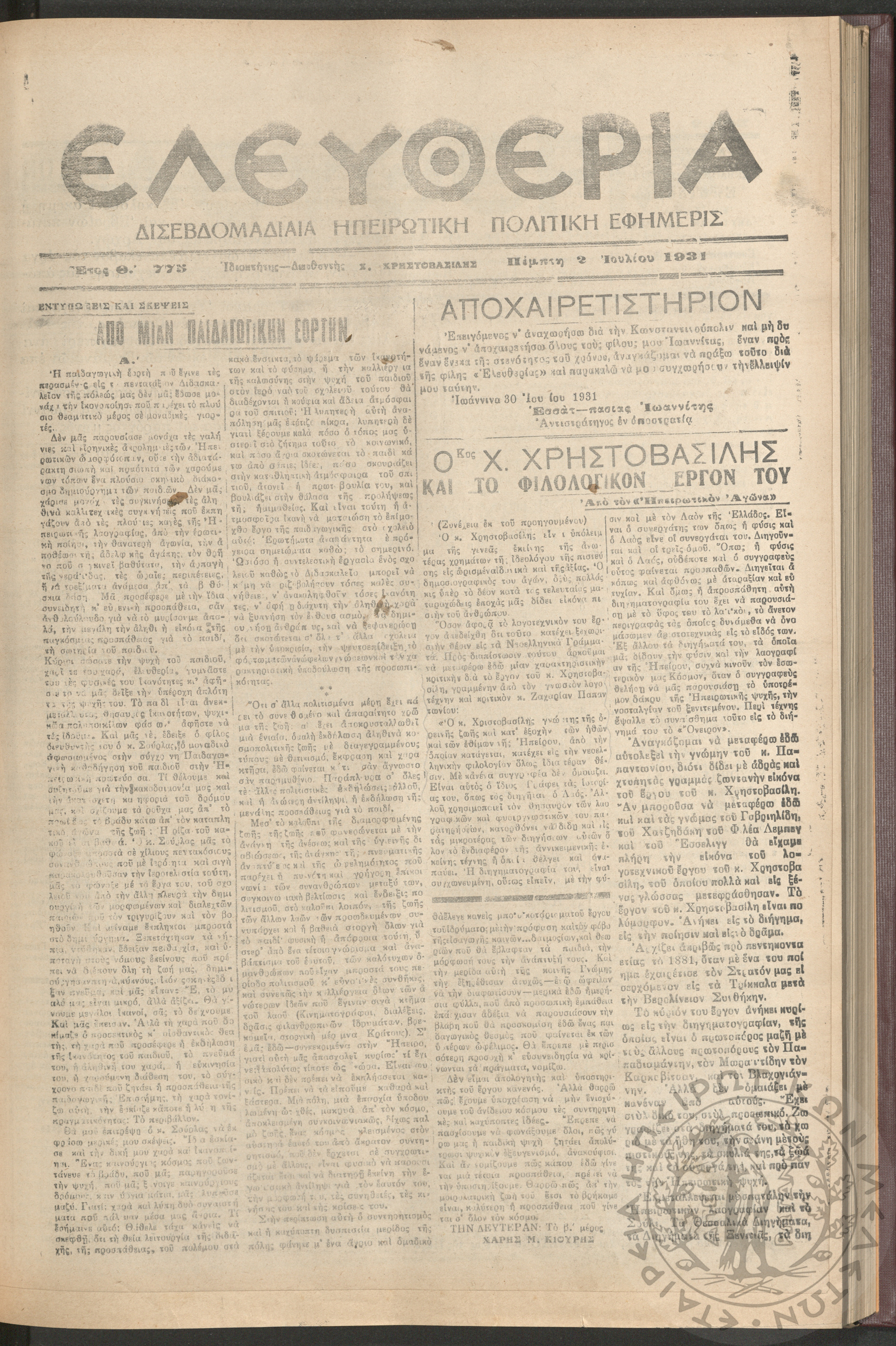 Ελευθερία: δισεβδομαδιαία Ηπειρωτική πολιτική εφημερίς, 1931, φ. 775