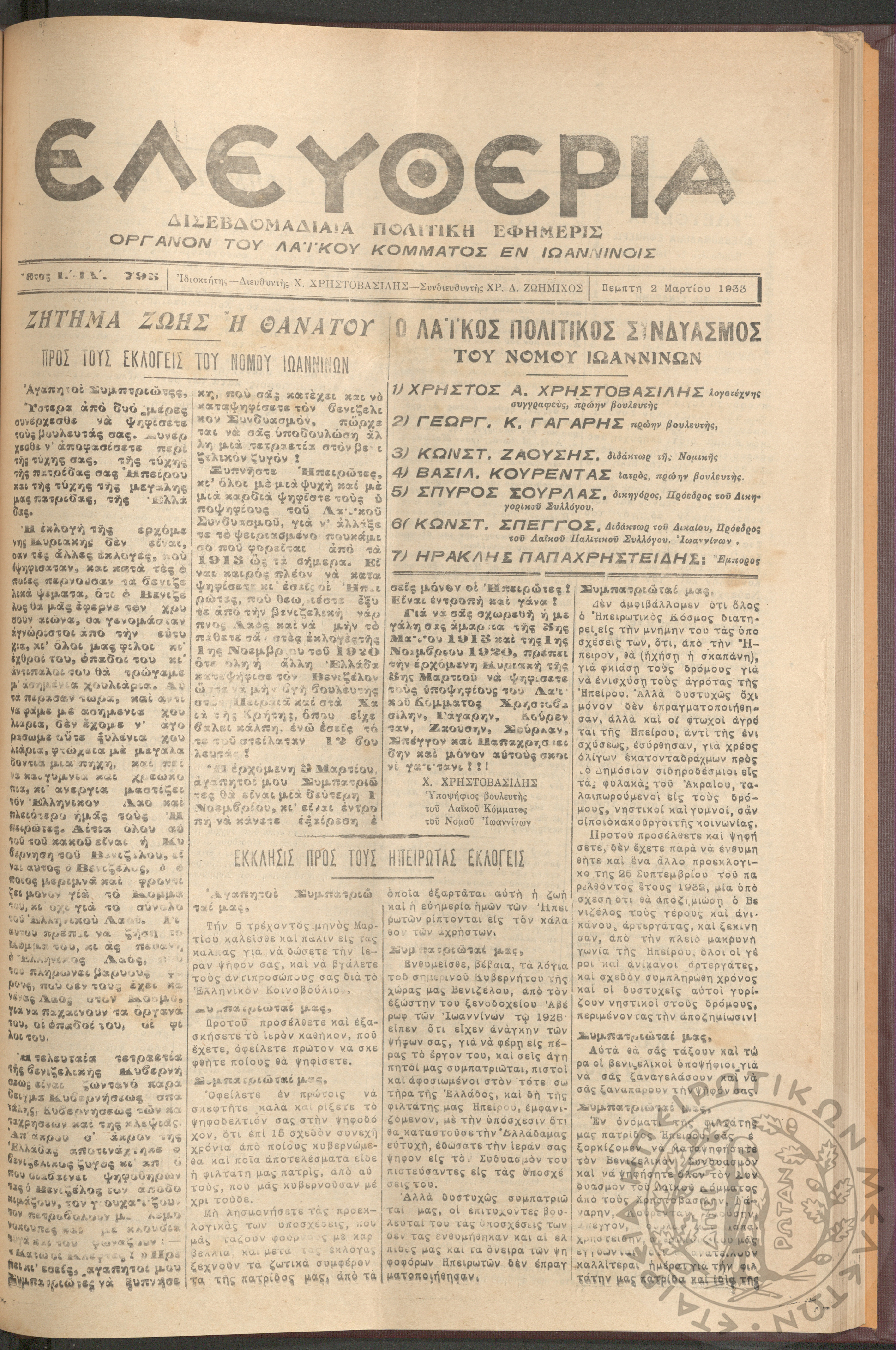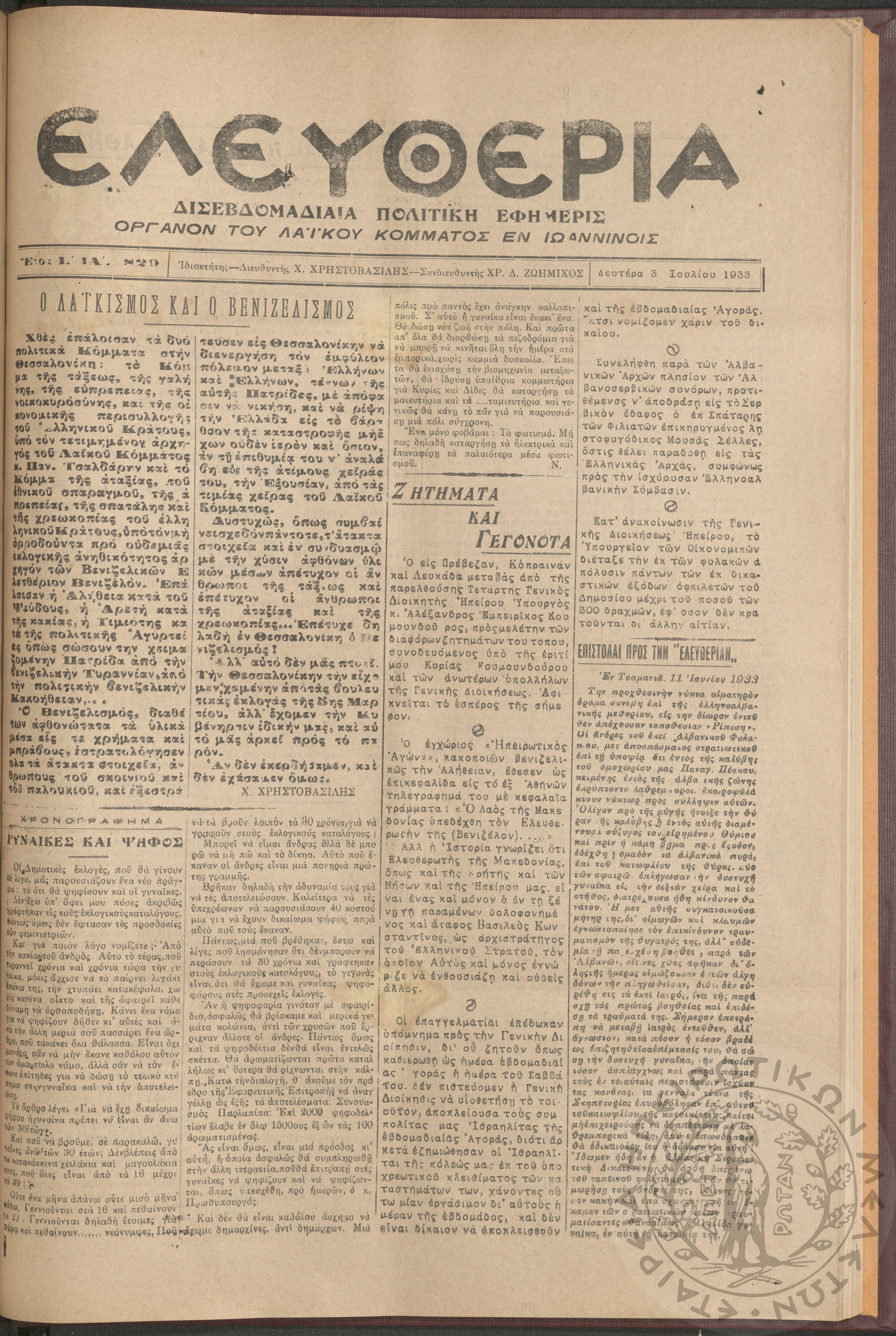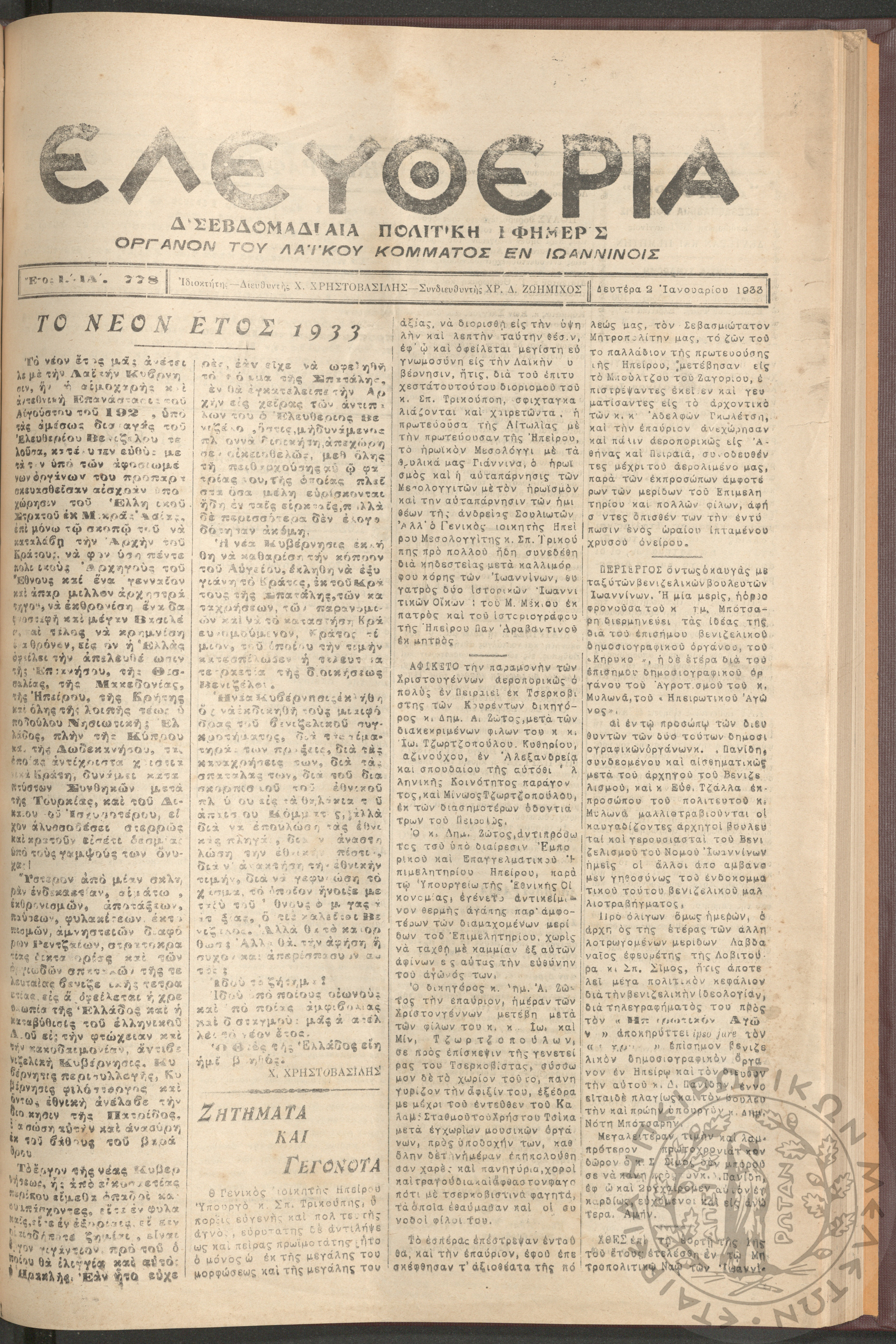 Ελευθερία: δισεβδομαδιαία Ηπειρωτική πολιτική εφημερίς, 1933, φ. 778
