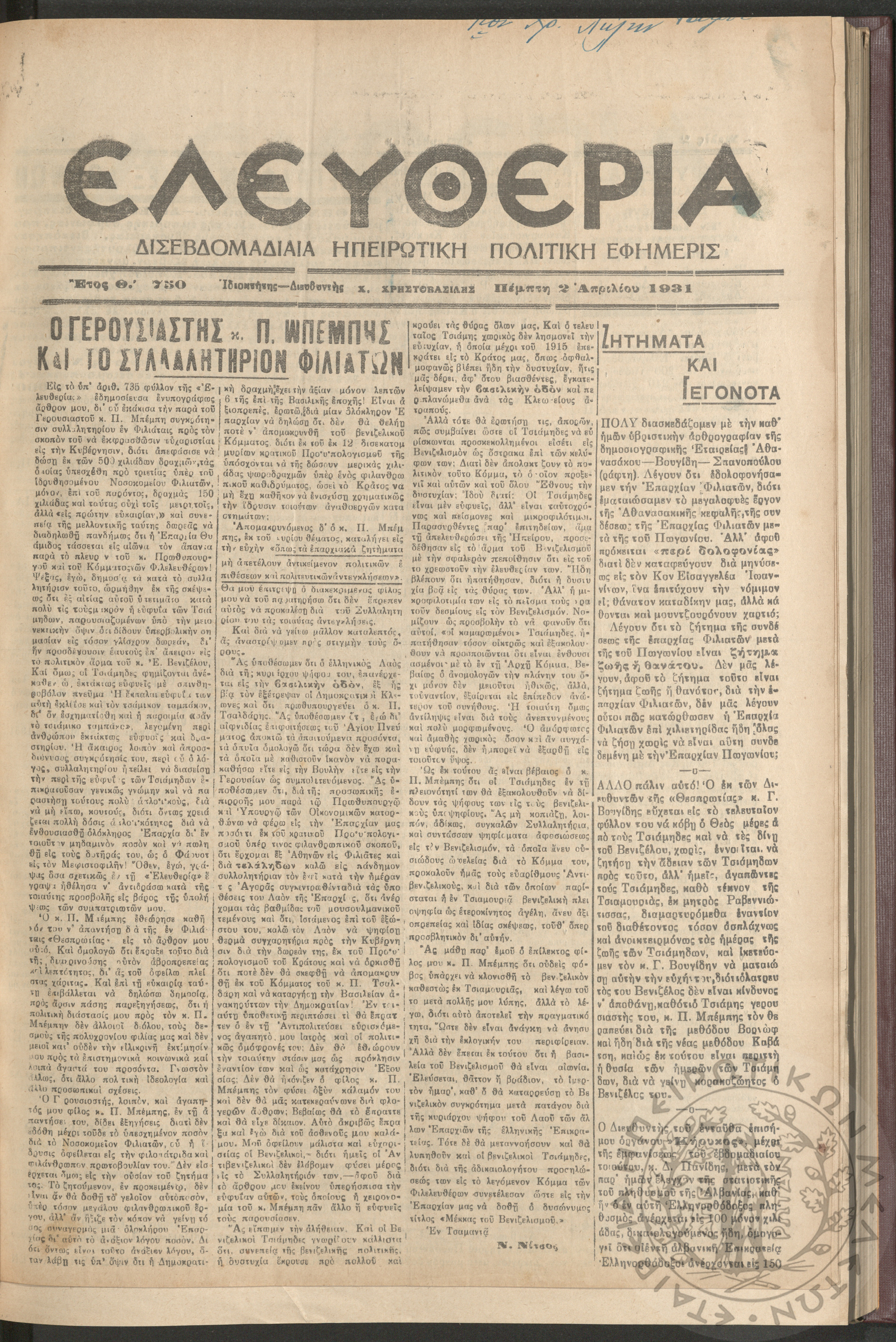 Ελευθερία: δισεβδομαδιαία Ηπειρωτική πολιτική εφημερίς, 1931, φ. 750