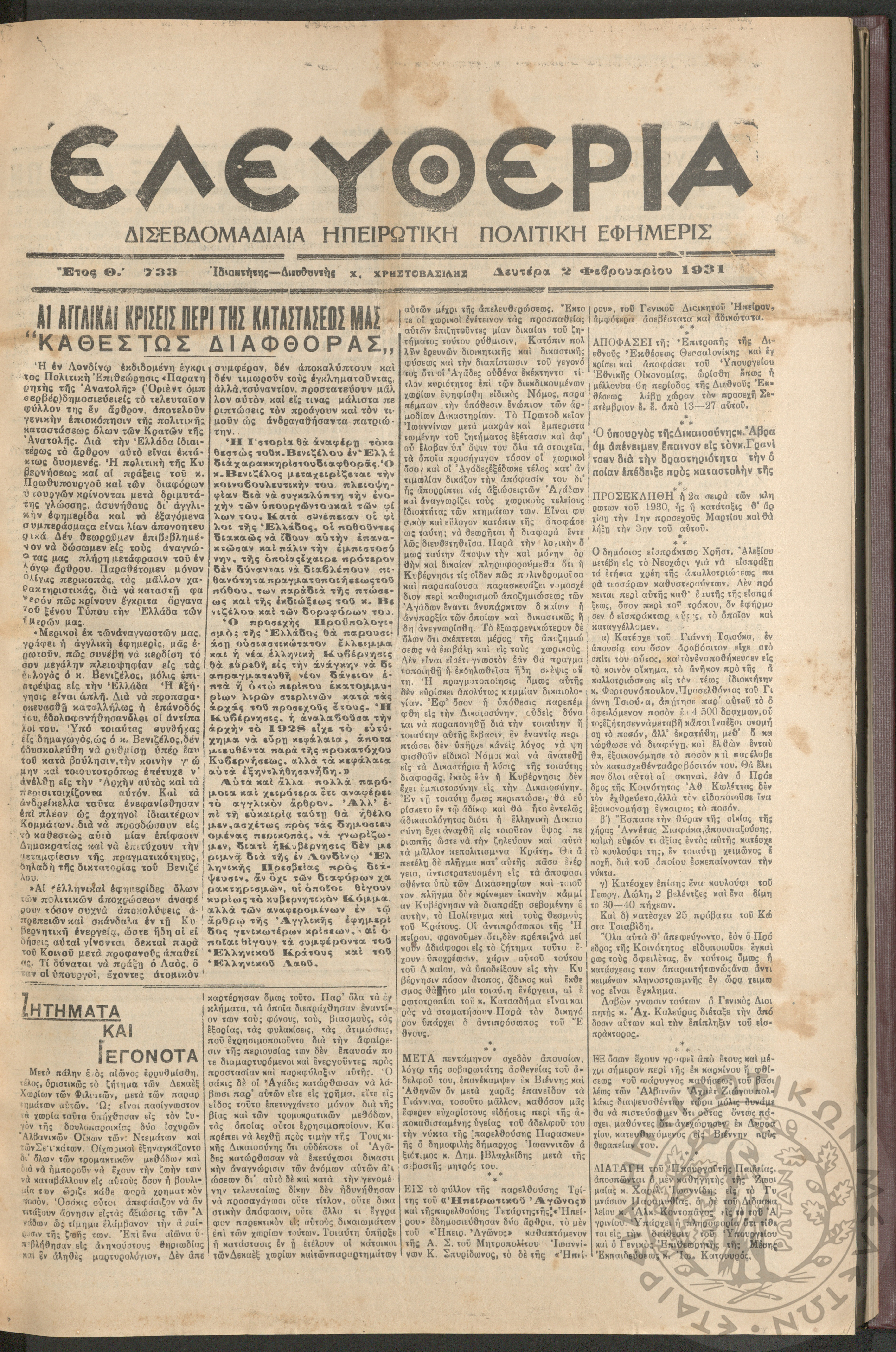 Ελευθερία: δισεβδομαδιαία Ηπειρωτική πολιτική εφημερίς, 1931, φ. 733