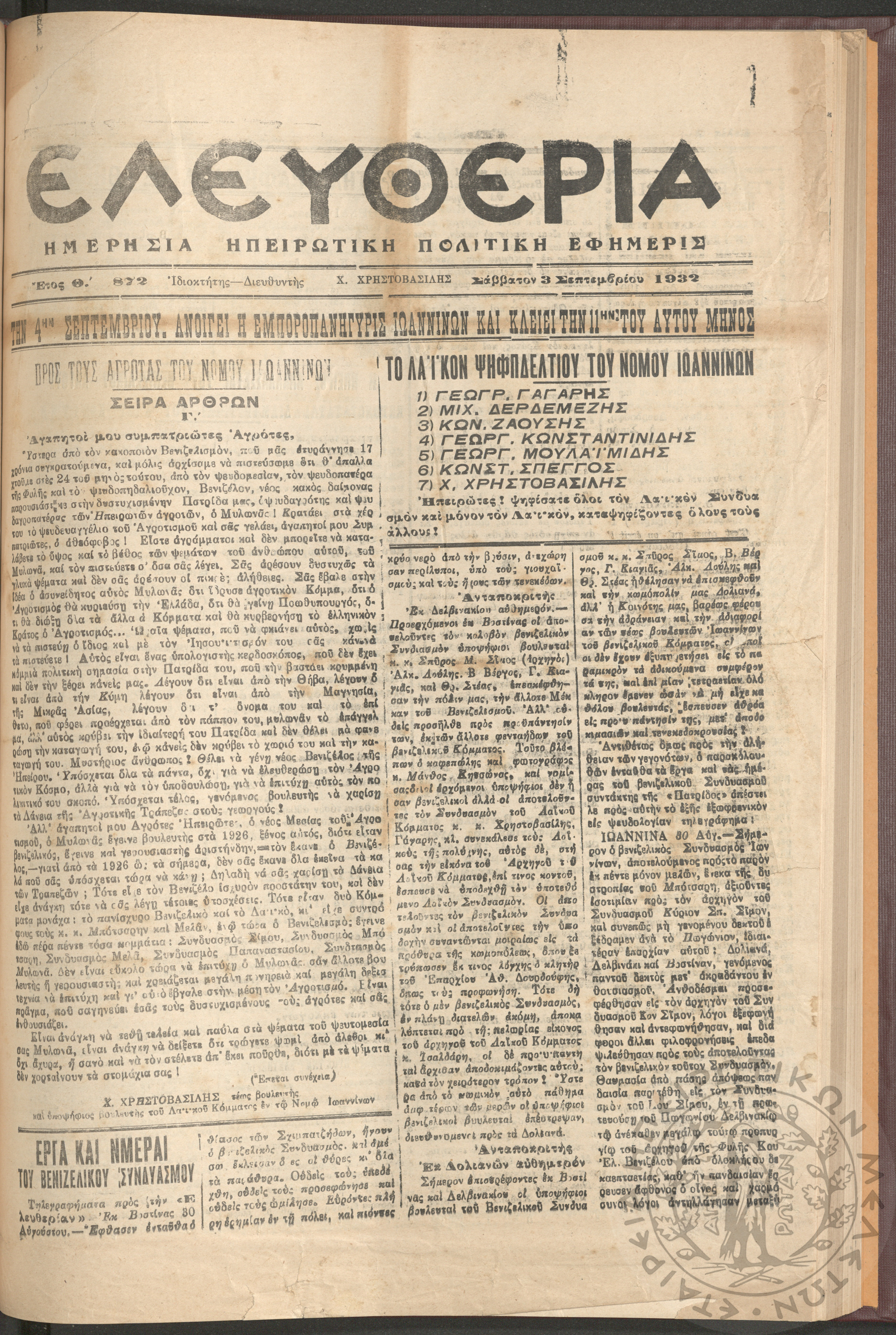 Ελευθερία: δισεβδομαδιαία Ηπειρωτική πολιτική εφημερίς, 1932, φ. 872