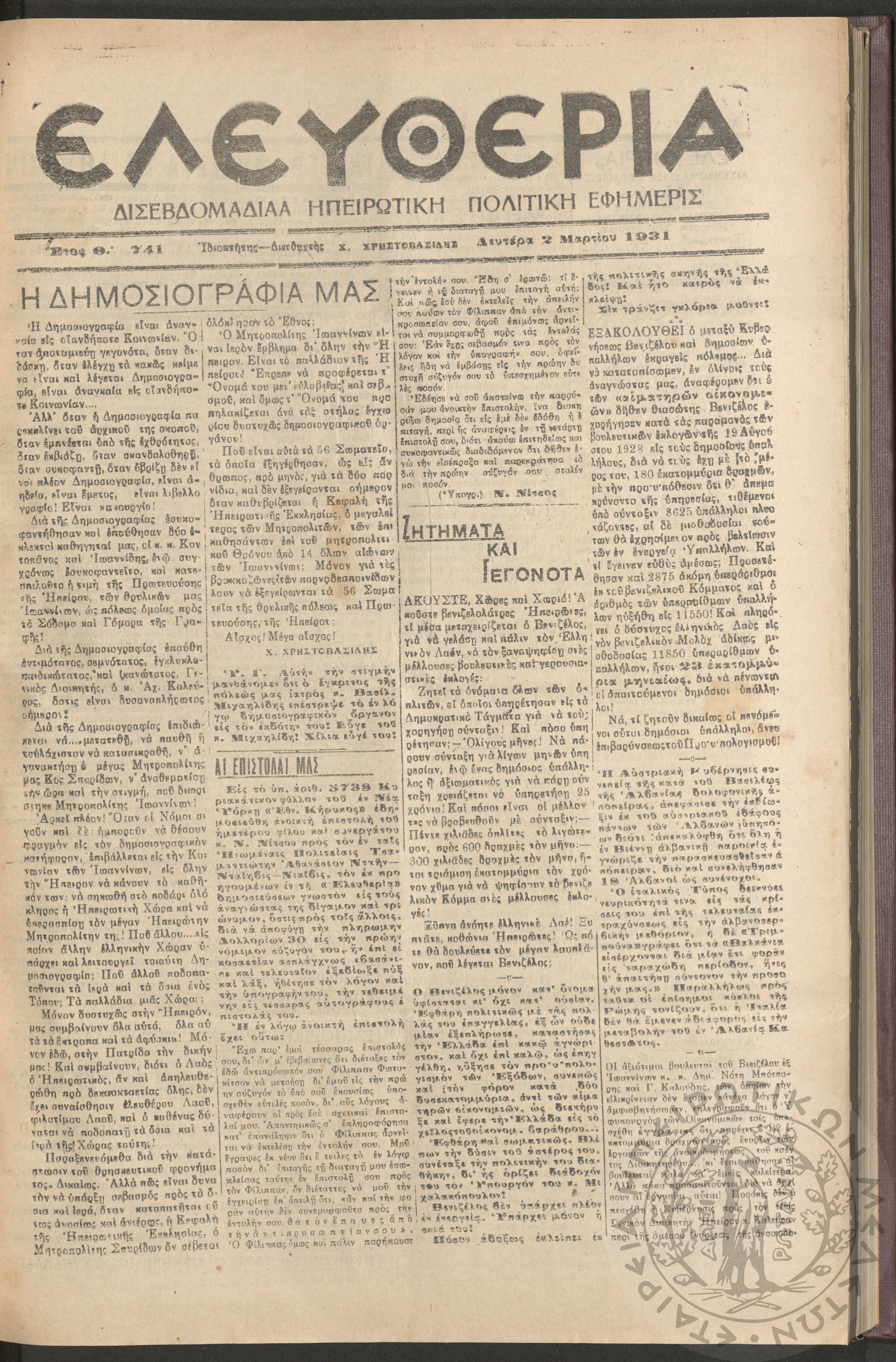 Ελευθερία: δισεβδομαδιαία Ηπειρωτική πολιτική εφημερίς, 1931, φ. 741