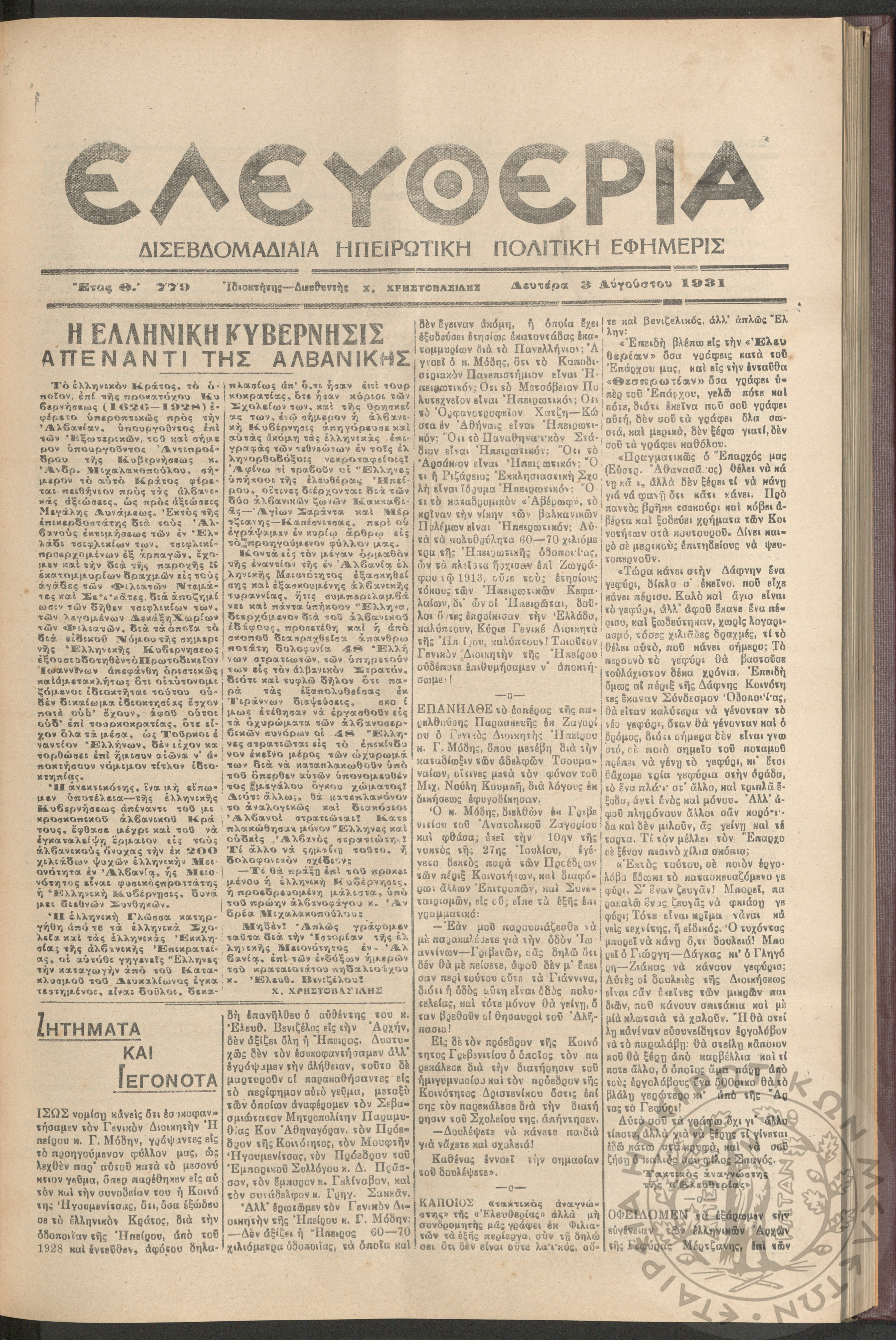 Ελευθερία: δισεβδομαδιαία Ηπειρωτική πολιτική εφημερίς, 1931, φ. 779