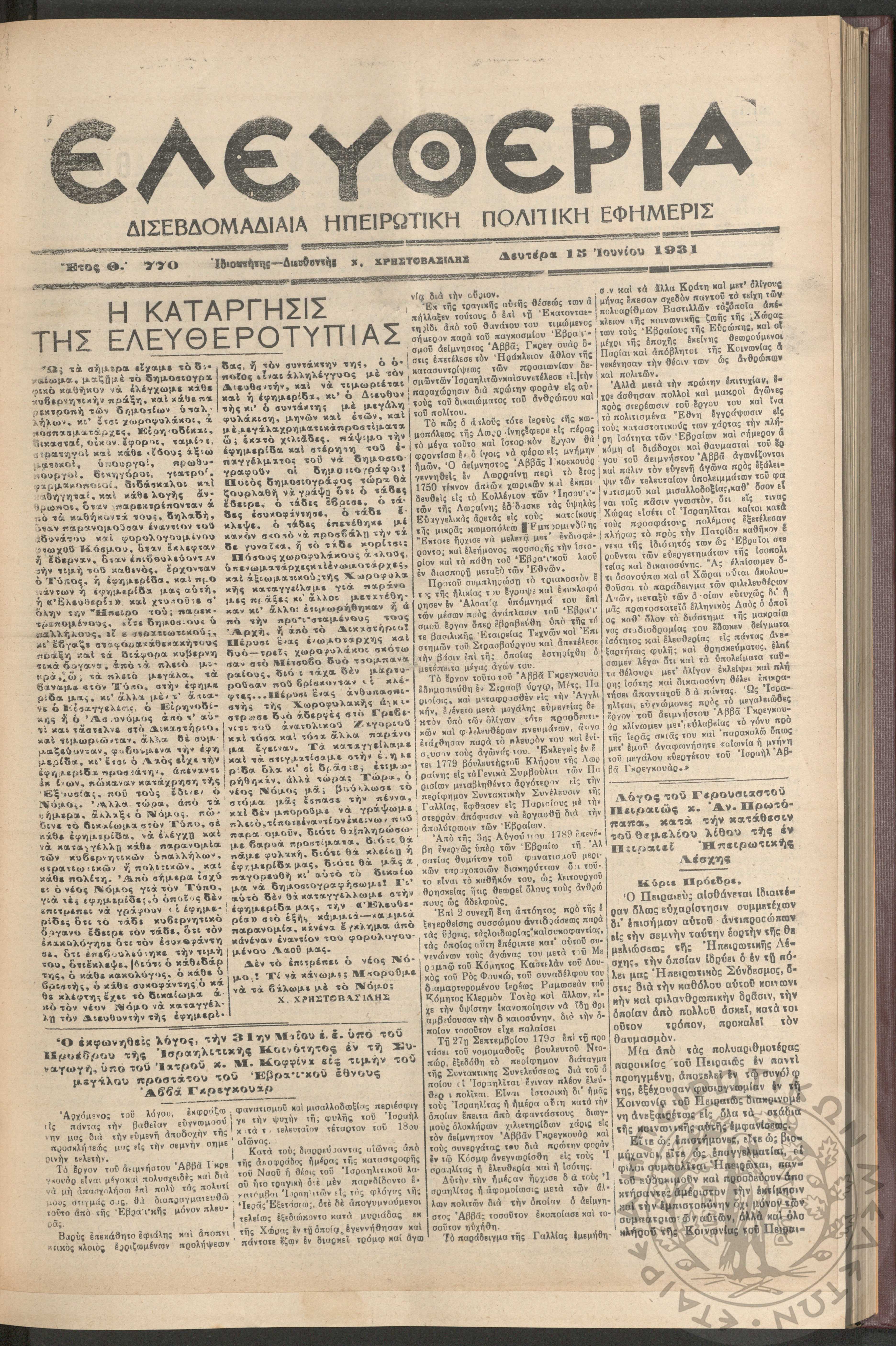 Ελευθερία: δισεβδομαδιαία Ηπειρωτική πολιτική εφημερίς, 1931, φ. 770