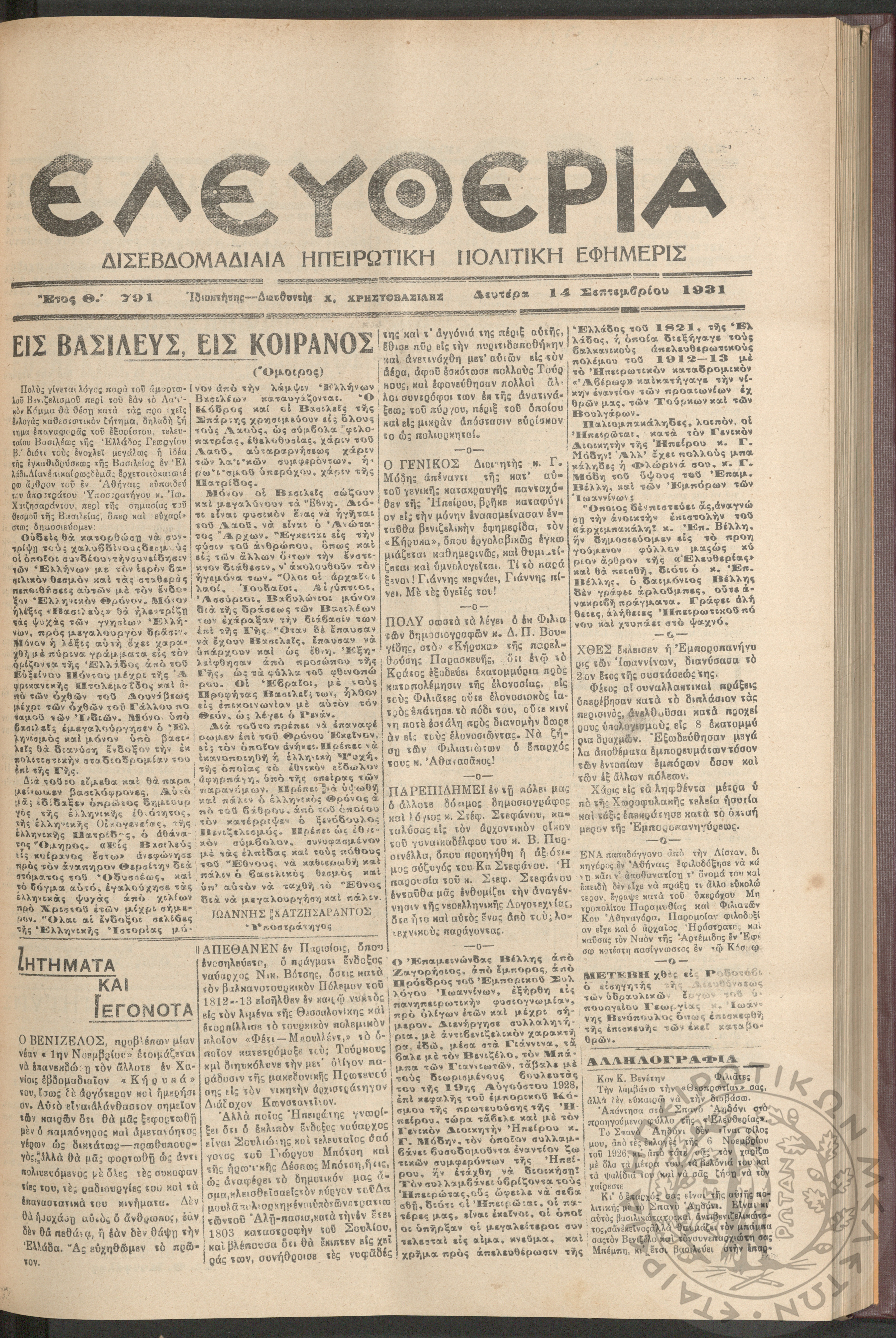 Ελευθερία: δισεβδομαδιαία Ηπειρωτική πολιτική εφημερίς, 1931, φ. 791