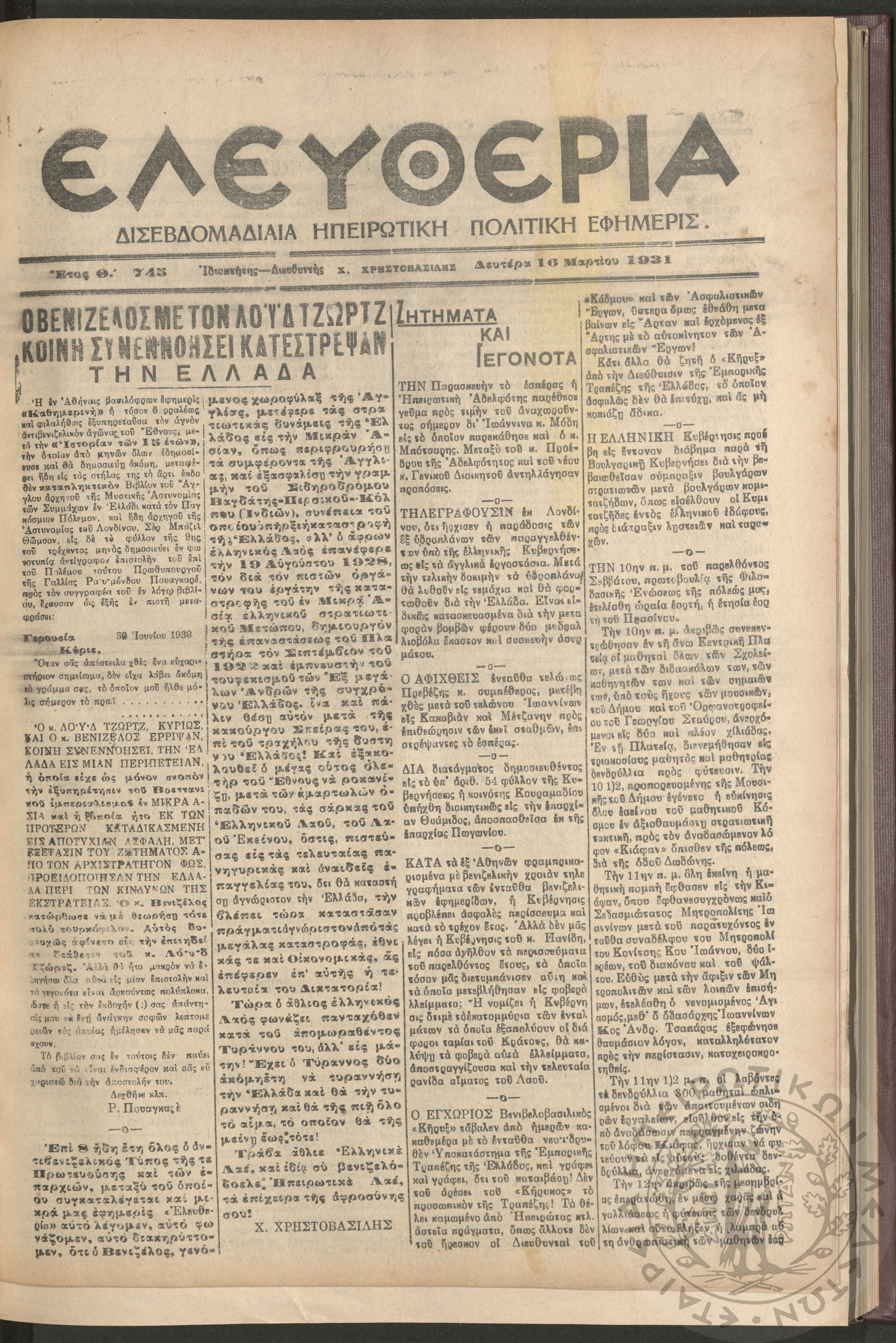 Ελευθερία: δισεβδομαδιαία Ηπειρωτική πολιτική εφημερίς, 1931, φ. 745