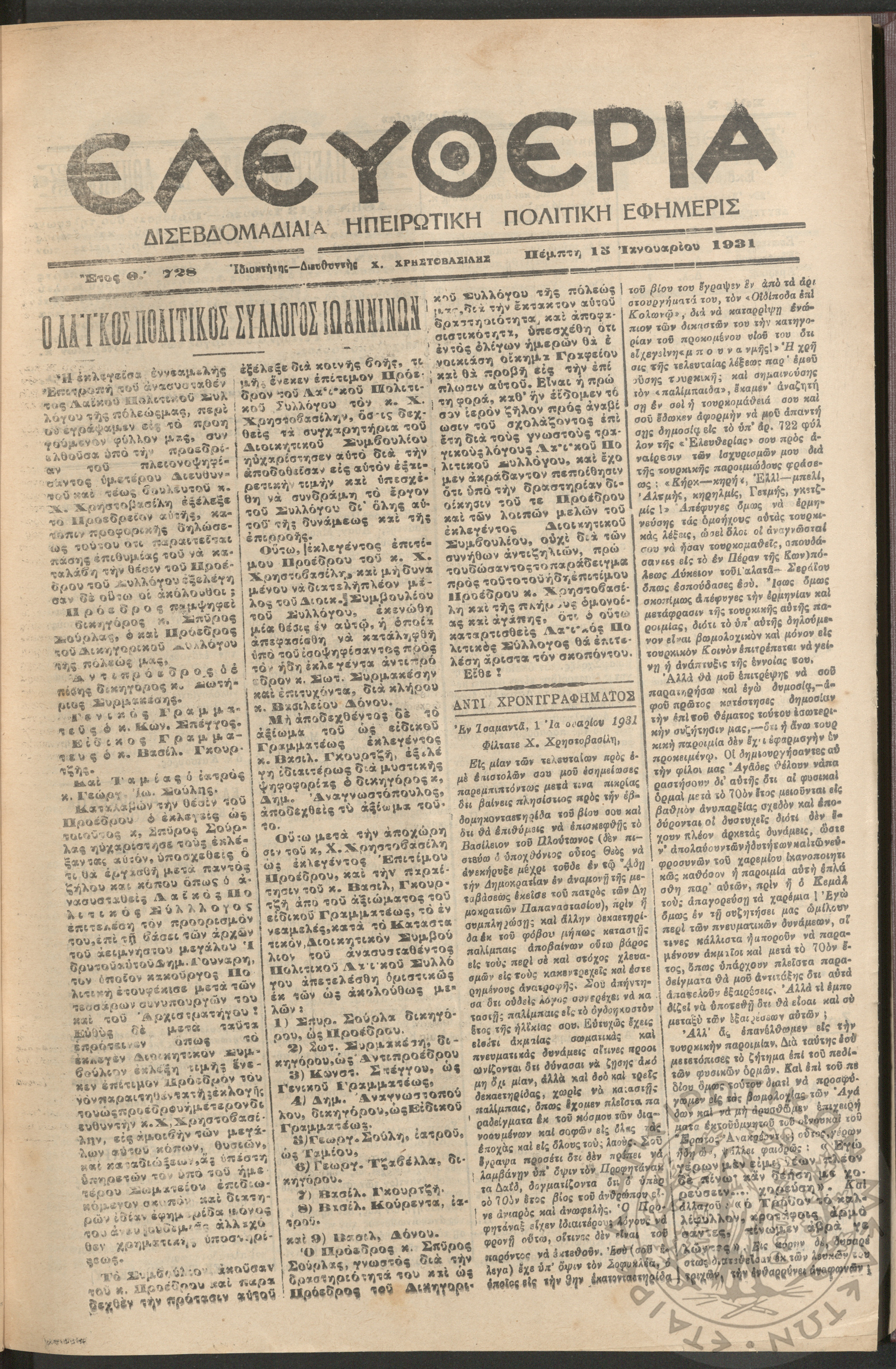 Ελευθερία: δισεβδομαδιαία Ηπειρωτική πολιτική εφημερίς, 1931, φ. 728