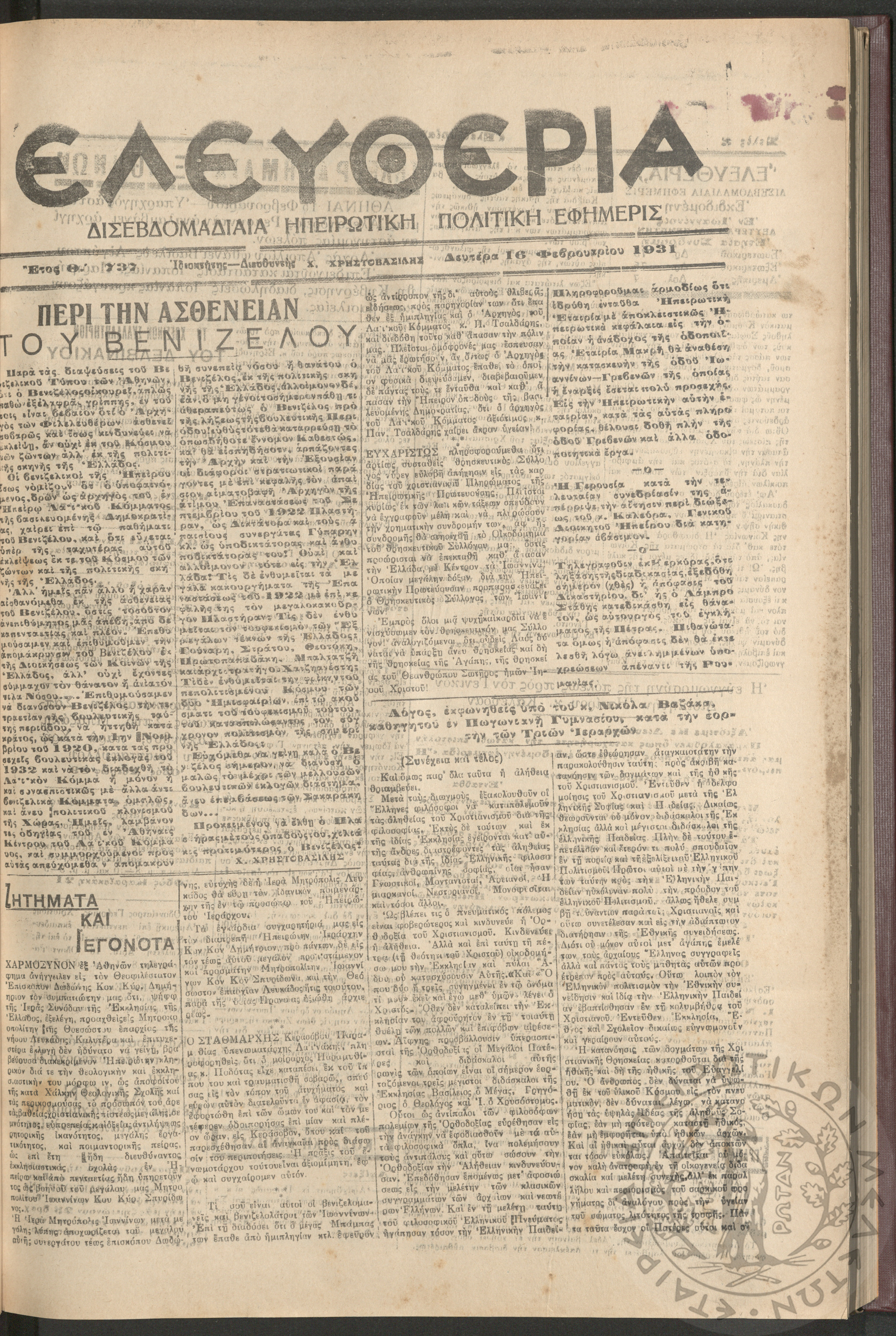 Ελευθερία: δισεβδομαδιαία Ηπειρωτική πολιτική εφημερίς, 1931, φ. 737